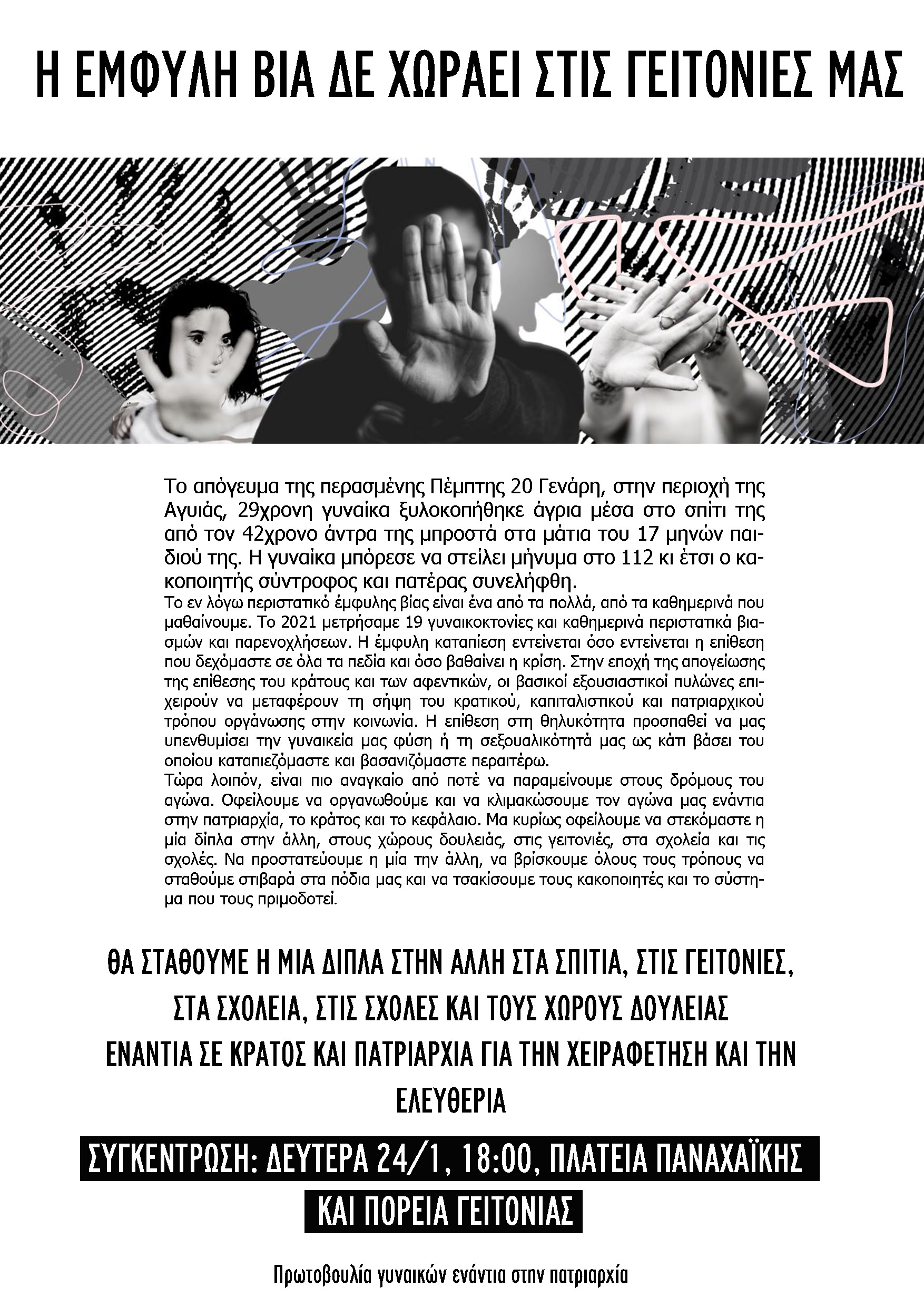 Τώρα λοιπόν, είναι πιο αναγκαίο από ποτέ να παραμείνουμε στους δρόμους του αγώνα. Οφείλουμε να οργανωθούμε και να κλιμακώσουμε τον αγώνα μας ενάντια στην πατριαρχία, το κράτος και το κεφάλαιο. Μα κυρίως οφείλουμε να στεκόμαστε η μία δίπλα στην άλλη, στους χώρους δουλειάς, στις γειτονιές, στα σχολεία και τις σχολές. Να προστατεύουμε η μία την άλλη, να βρίσκουμε όλους τους τρόπους να σταθούμε στιβαρά στα πόδια μας και να τσακίσουμε τους κακοποιητές και το σύστημα που τους πριμοδοτεί.
