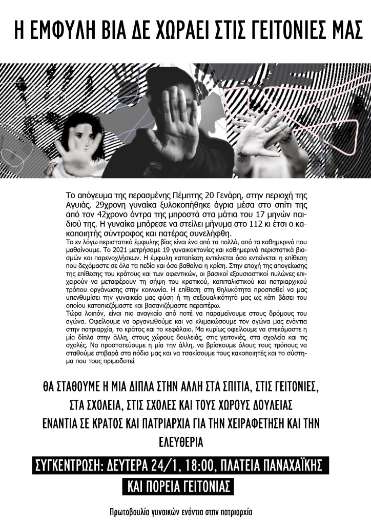Το εν λόγω περιστατικό έμφυλης βίας είναι ένα από τα πολλά, από τα καθημερινά που μαθαίνουμε. Το 2021 μετρήσαμε 19 γυναικοκτονίες και καθημερινά περιστατικά βιασμών και παρενοχλήσεων. Η έμφυλη καταπίεση εντείνεται όσο εντείνεται η επίθεση που δεχόμαστε σε όλα τα πεδία και όσο βαθαίνει η κρίση. Στην εποχή της απογείωσης της επίθεσης του κράτους και των αφεντικών, οι βασικοί εξουσιαστικοί πυλώνες επιχειρούν να μεταφέρουν τη σήψη του κρατικού, καπιταλιστικού και πατριαρχικού τρόπου οργάνωσης στην κοινωνία. Η επίθεση στη θηλυκότητα προσπαθεί να μας υπενθυμίσει την γυναικεία μας φύση ή τη σεξουαλικότητά μας ως κάτι βάσει του οποίου καταπιεζόμαστε και βασανιζόμαστε περαιτέρω.