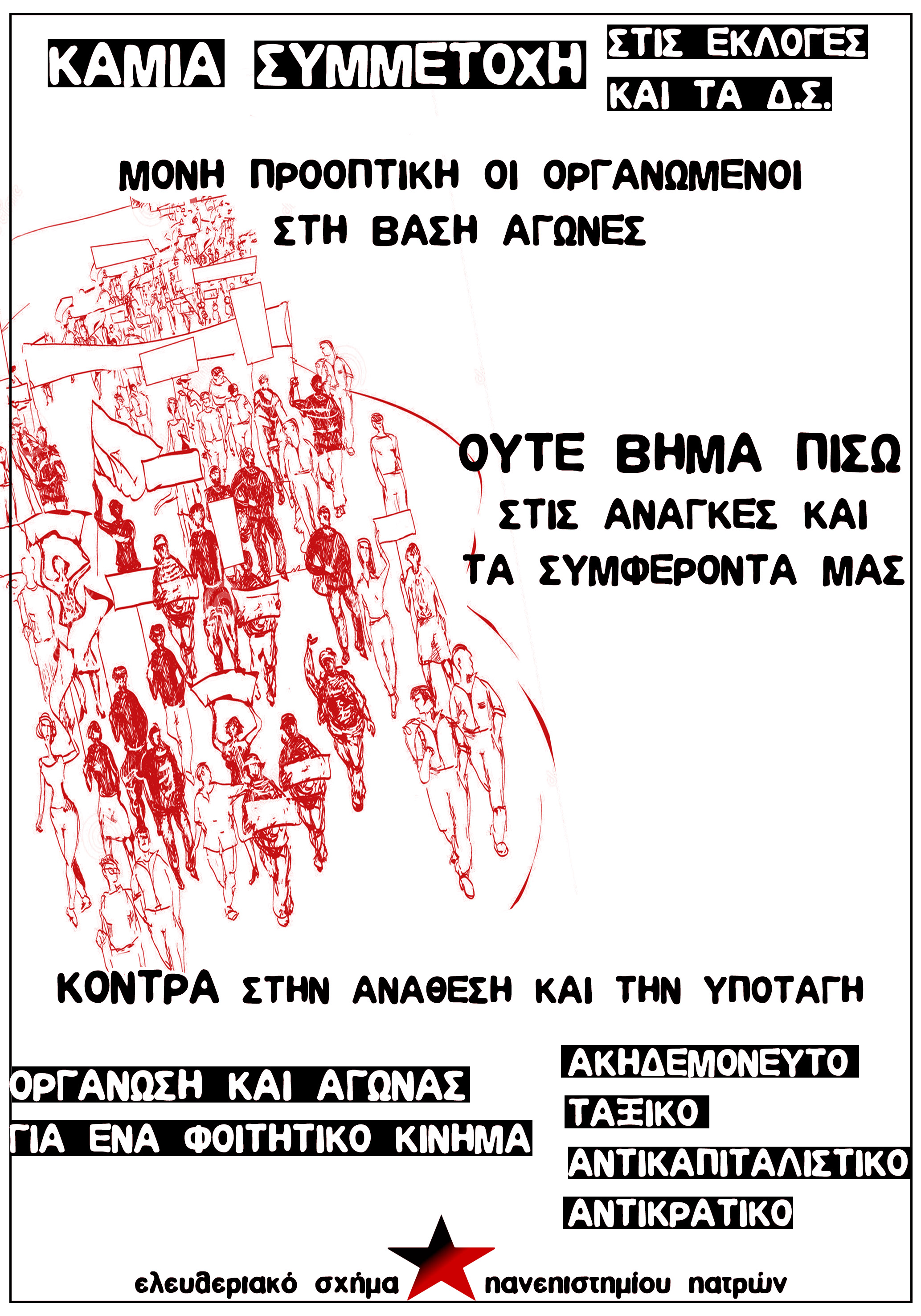 Ενάντια λοιπόν, στις φοιτητικές εκλογές και τα Δ.Σ, ενάντια στην ανάθεση και την υποταγή στις αποφάσεις των λίγων «ειδικών», ενάντια στον γραφειοκρατικό συνδικαλισμό, εμείς έχουμε να αντιτάξουμε τον ακηδεμόνευτο, ταξικό φοιτητικό συνδικαλισμό, τους οργανωμένους – στη βάση- φοιτητικούς αγώνες, τις γενικές συνελεύσεις, τους κοινούς αγώνες των φοιτητών, των μαθητών, των εργαζομένων και όλων των ανθρώπων της τάξης μας. Είναι πιο αναγκαίο από ποτέ να κάνουμε τον συνδικαλισμό ξανά επικίνδυνο, δίνοντας καθημερινά μάχη μέσα στις σχολές, δημιουργώντας ένα φοιτητικό κίνημα που θα έρχεται σε ρήξη με το κράτος και το κεφάλαιο, θα υψώνει αναχώματα στην επίθεση που δεχόμαστε και, συνειδητοποιώντας την δύναμή του, θα βρίσκεται στην πρώτη γραμμή των αγώνων. Και αυτό το κίνημα δεν μπορεί παρά να είναι ταξικό, οριζόντιο και μαχητικό, να βασίζεται δηλαδή, στις ελευθεριακές αρχές και μεθόδους δράσης.