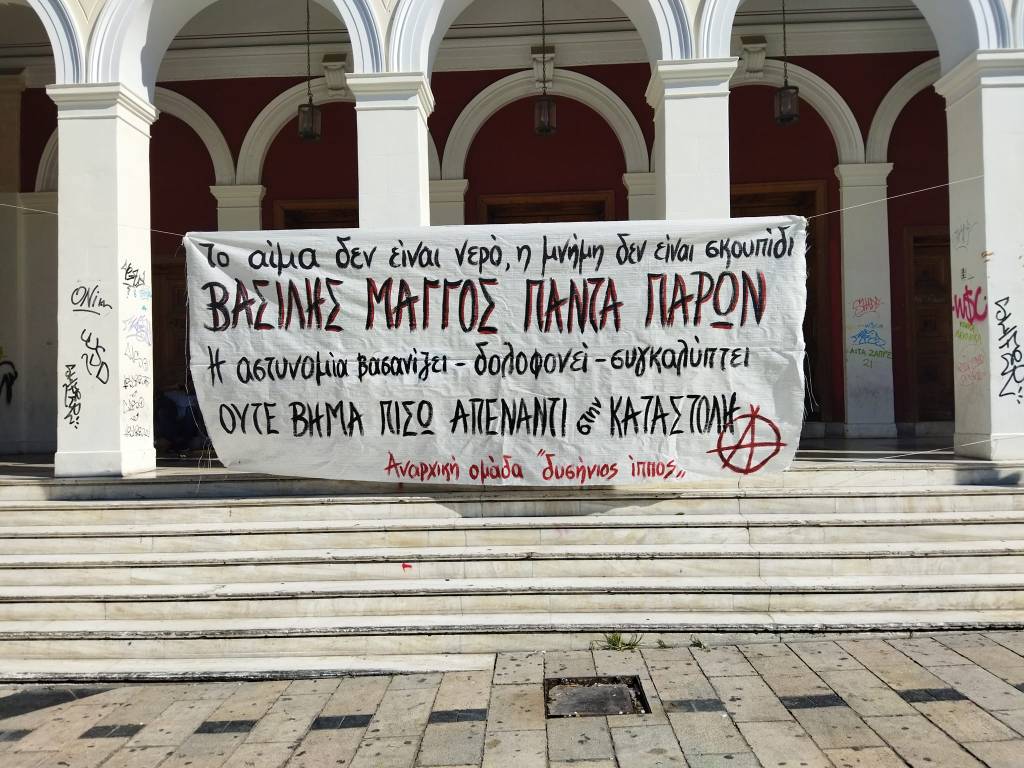 Πανό στο κέντρο της Πάτρας ενάντια στην συγκάλυψη της υπόθεσης του Βασίλη Μάγγου, με αφορμή την έναρξη της δίκης των βασανιστών του στον Βόλο.