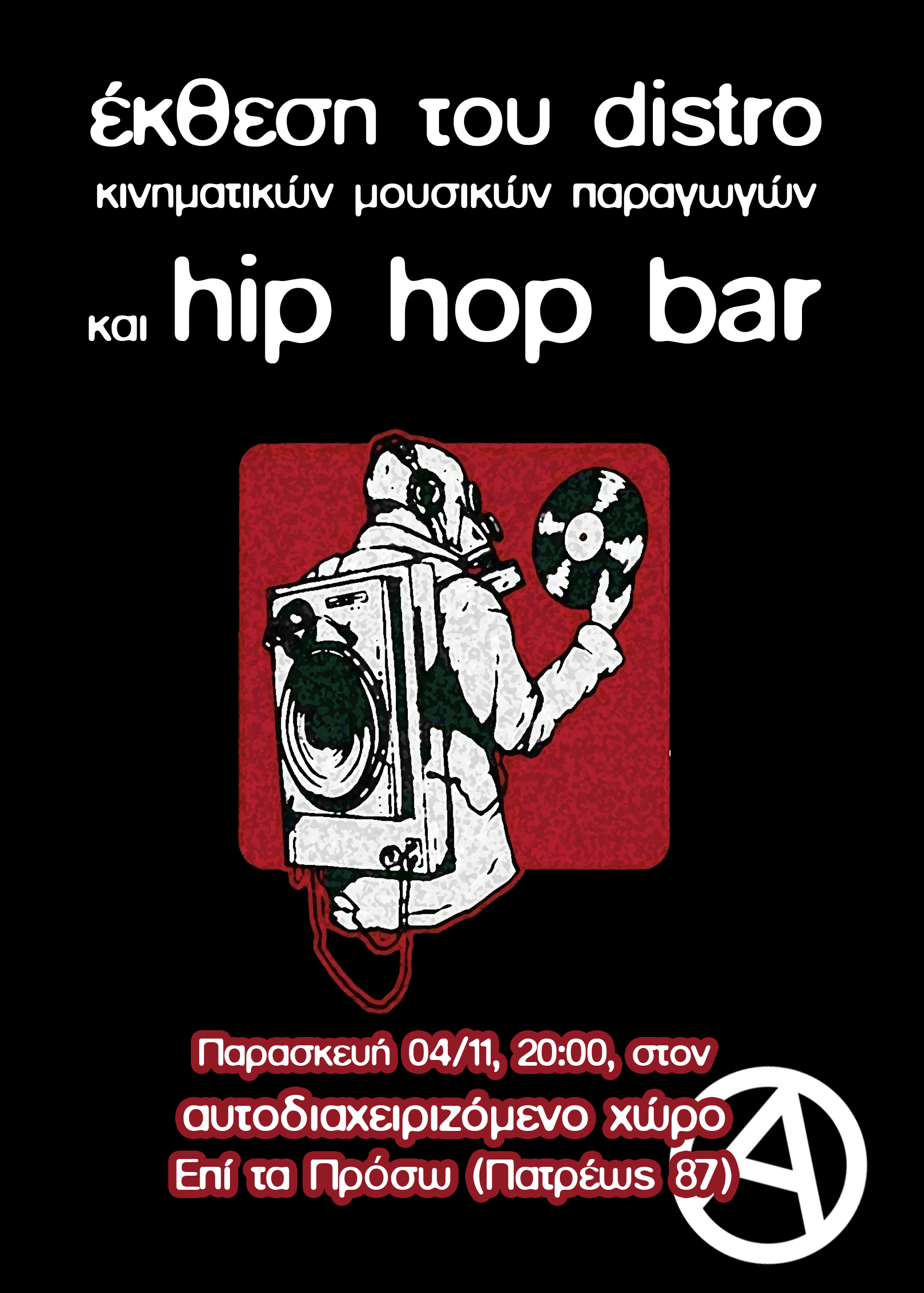 Έκθεση του distro κινηματικών μουσικών παραγωγών και hip hop bar Παρασκευή 04/11, 20:00, στον αυτοδιαχειριζόμενο χώρο Επί τα Πρόσω (Πατρέως 87) Share this: Click to share on Facebook (Opens in new window) Facebook Click to share on X (Opens in new window) X Like Loading... Related