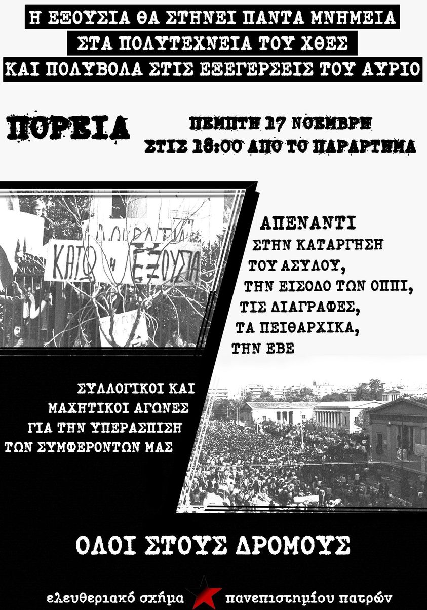 Η φετινή επέτειος της εξέγερσης του Πολυτεχνείου έρχεται μέσα σε μια περίοδο λυσσαλέας επίθεσης του κράτους και των αφεντικών σε βάρος της κοινωνικής πλειοψηφίας. Με την καταστολή να αποτελεί κανόνα για όποιον τολμάει να βγει στον δρόμο, τα ΜΜΕ να λασπολογούν και να διασπείρουν τον τρόμο, την ακρίβεια να ωθεί όλο και περισσότερους ανθρώπους στο όριο της φτώχειας, και τα φοιτητικά κεκτημένα όπως το άσυλο να ισοπεδώνονται ένα-ένα, εμείς οφείλουμε να κρατήσουμε τη φλόγα της εξέγερσης του Πολυτεχνείου ζωντανή.Γιατί το πολυτεχνείο τρόμαζε και θα τρομάζει την εξουσία. Και όσο προσπαθούν να διαστρεβλώσουν την ιστορική αλήθεια μετατρέποντάς το σε ακίνδυνη εθνική γιορτή, εμείς θα αφορμόμαστε από τους αγώνες του παρελθόντος μην ξεχνώντας τους νεκρούς που έφερε η καταστολή των μετέπειτα επετείων της 17ης Νοέμβρη. Για τον Ιάκωβο Κουμή, τη Σταματίνα Κανελοπούλου, τον Μιχάλη Καλτεζά. Κόντρα λοιπόν στη καταστολή και την ποινικοποίηση των αγώνων μας, κόντρα στην όξυνση των ταξικών φραγμών, κόντρα στην δημιουργία ενός πανεπιστημίου που θα χωρά όλο και λιγότερους, οφείλουμε να πιάσουμε ξανά το νήμα των αγώνων και να υπερασπιστούμε με κάθε κόστος τις ανάγκες και τα ταξικά μας συμφέροντα. Να οργανωθούμε, να προτάξουμε την πίστη στον συλλογικό αγώνα, την αλληλεγγύη και την αυτοοργάνωση. Με όργανα λήψης αποφάσεων τις γενικές συνελεύσεις, όπλα τις συντονισμένες – στη βάση – καταλήψεις διαρκείας και τις μαζικές διαδηλώσεις να μετατρέψουμε τις σχολές σε ζωντανά κέντρα αγώνα, σε τόπους συλλογικής συζήτησης, ζύμωσης, αμφισβήτησης και αντίστασης.