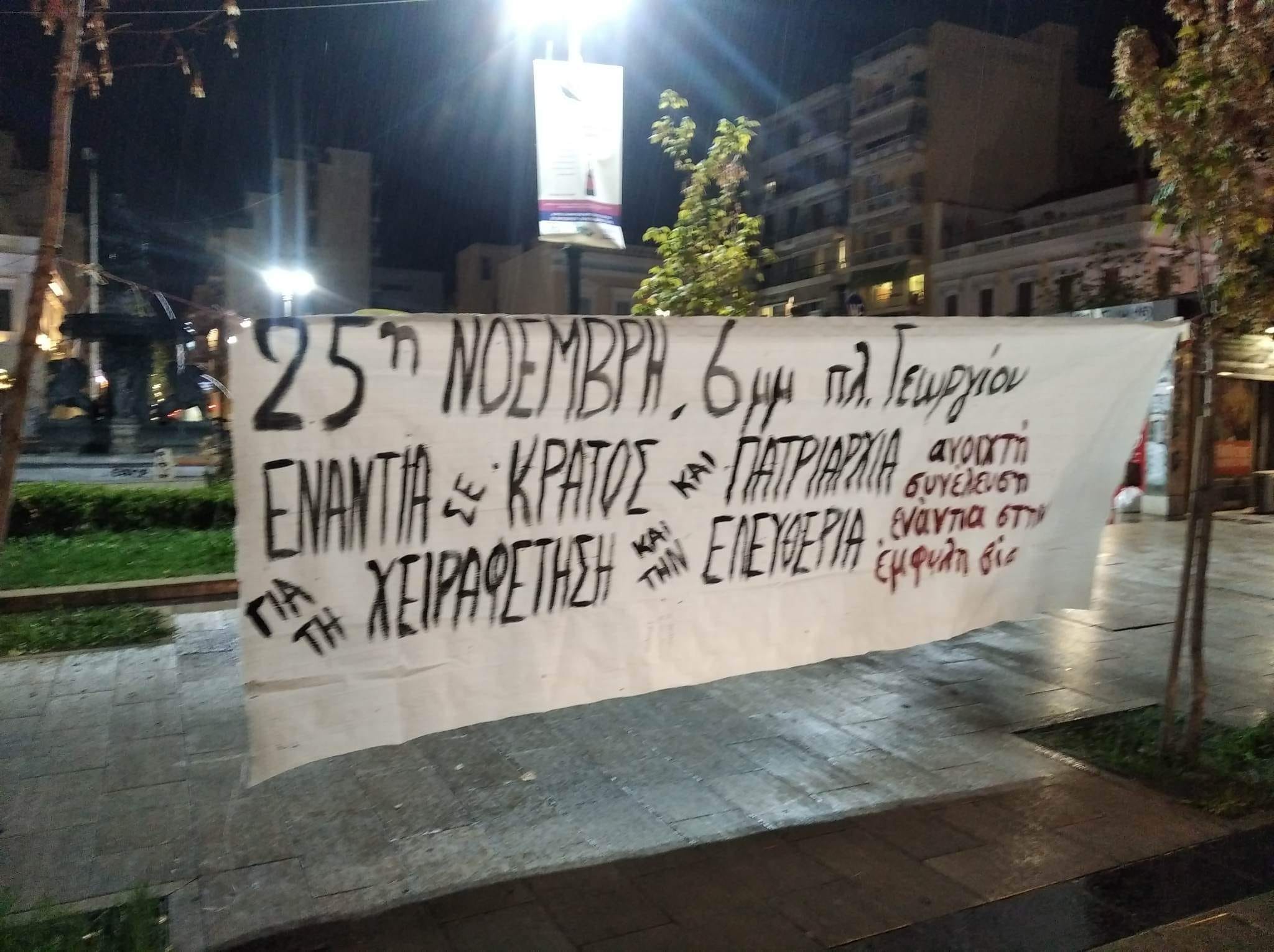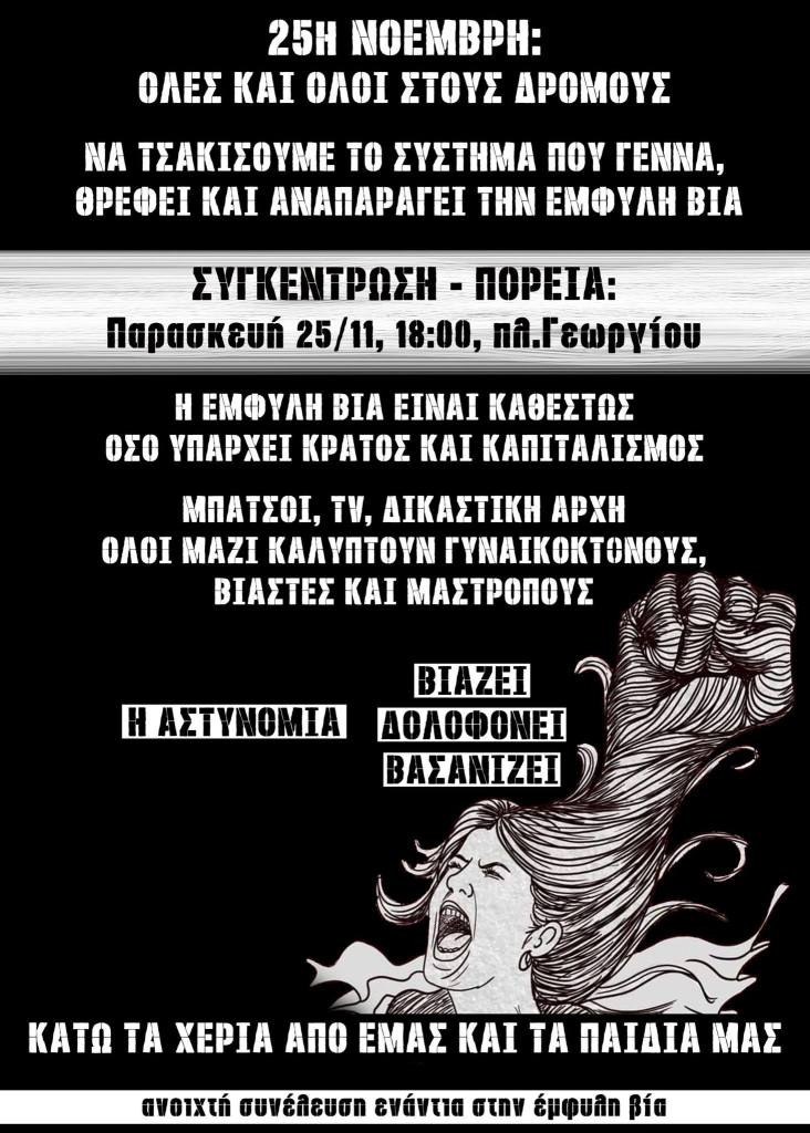 Από την ανοιχτή συνέλευση ενάντια στην έμφυλη βία που συγκροτήθηκε μετά από κάλεσμα της πρωτοβουλίας γυναικών ενάντια στην πατριαρχία προέκυψε το κάλεσμα στη διαδήλωση της 25ης Νοέμβρη, στις 18:00 από την πλατεία Γεωργίου.