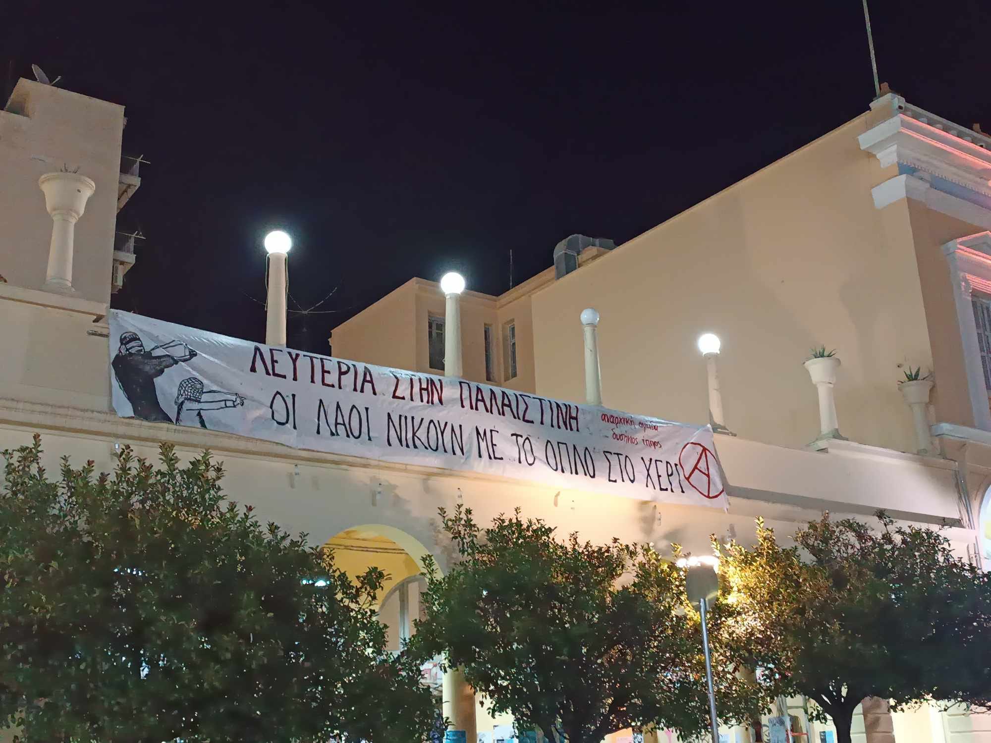 Πανό στον Έσπερο στην πλατεία Γεωργίου που κρεμάστηκε από την αναρχική ομάδα δυσήνιος ίππος σήμερα το απόγευμα στην Πάτρα