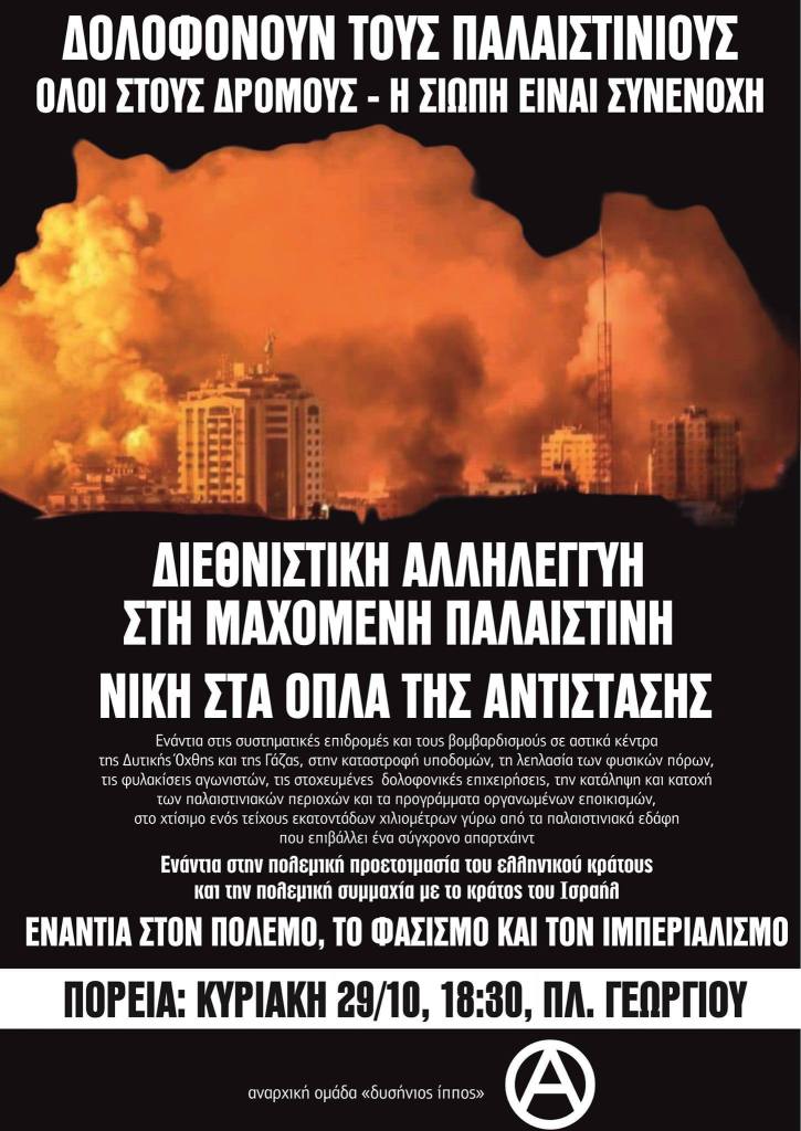 ΔΟΛΟΦΟΝΟΥΝ ΤΟΥΣ ΠΑΛΑΙΣΤΙΝΙΟΥΣ ΟΛΟΙ ΣΤΟΥΣ ΔΡΟΜΟΥΣ. Η ΣΙΩΠΗ ΕΙΝΑΙ ΣΥΝΕΝΟΧΗ ΔΙΕΘΝΙΣΤΙΚΗ ΑΛΛΗΛΕΓΓΥΗ ΣΤΗ ΜΑΧΟΜΕΝΗ ΠΑΛΑΙΣΤΙΝΗ ΝΙΚΗ ΣΤΑ ΟΠΛΑ ΤΗΣ ΑΝΤΙΣΤΑΣΗΣ ΠΟΡΕΙΑ: ΚΥΡΙΑΚΗ 29 ΟΚΤΩΒΡΗ, 18.30 – ΠΛ. ΓΕΩΡΓΙΟΥ Share this: Click to share on Facebook (Opens in new window) Facebook Click to share on X (Opens in new window) X Like Loading... Related