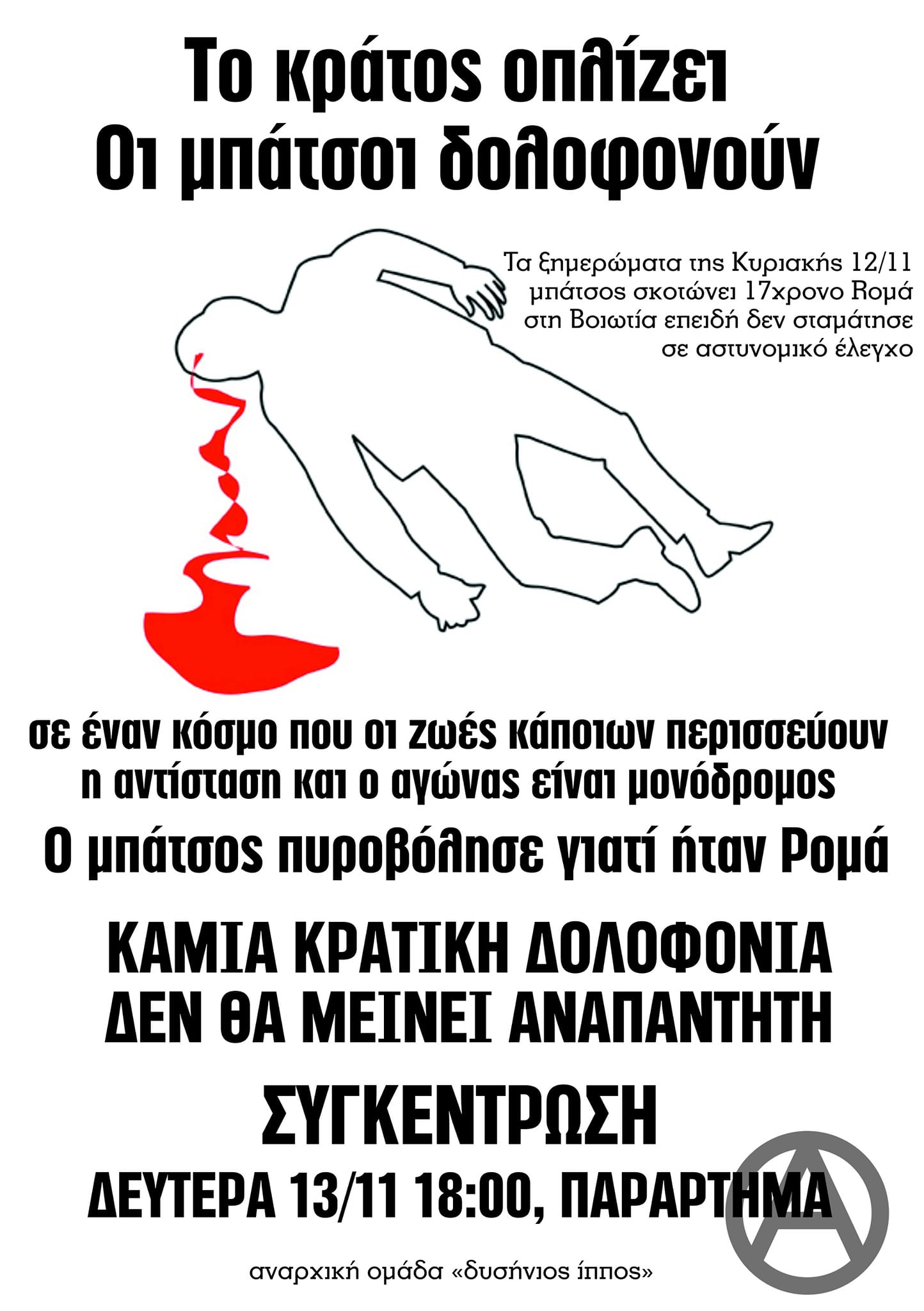 ΣΥΓΚΕΝΤΡΩΣΗ: ΔΕΥΤΕΡΑ 13/11 18:00, ΠΑΡΑΡΤΗΜΑΤο κράτος οπλίζει – Οι μπάτσοι δολοφονούν σε έναν κόσμο που οι ζωές κάποιων περισσεύουν… η αντίσταση και ο αγώνας είναι μονόδρομος Ο μπάτσος πυροβόλησε γιατί ήταν Ρομά ΚΑΜΙΑ ΚΡΑΤΙΚΗ ΔΟΛΟΦΟΝΙΑ ΔΕ ΘΑ ΜΕΙΝΕΙ ΑΝΑΠΑΝΤΗΤΗ Share this: Click to share on Facebook (Opens in new window) Facebook Click to share on X (Opens in new window) X Like Loading... Related