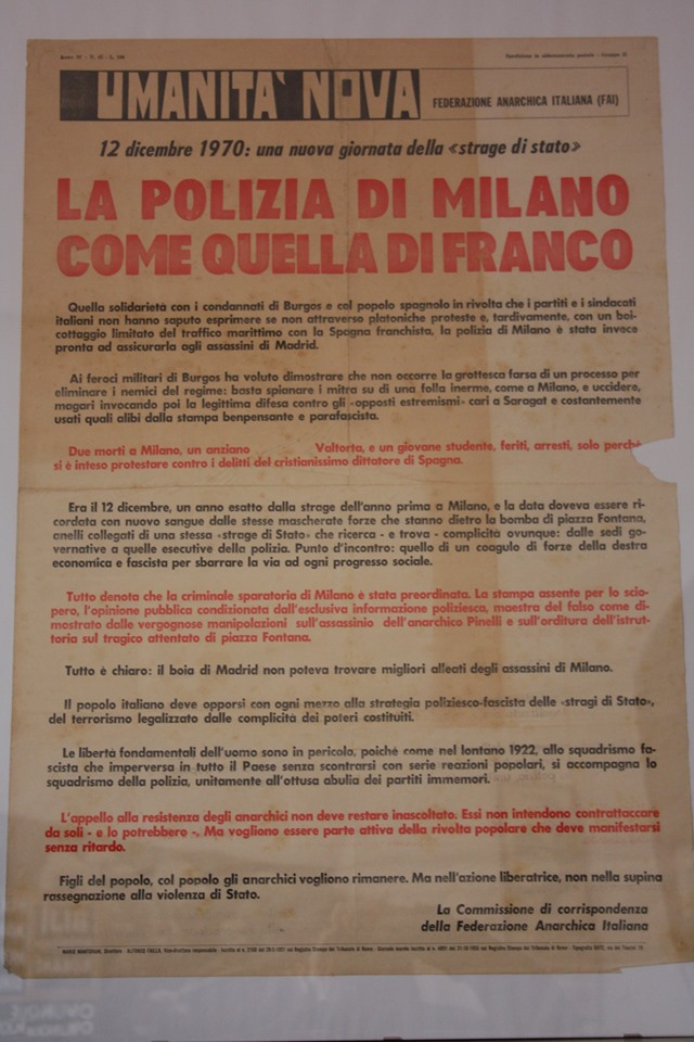Με αφορμή τη συμπλήρωση 56 χρόνων από την έκρηξη της βόμβας στην Πιάτσα Φοντάνα του Μιλάνο και την κρατική δολοφονία του αναρχικού Πινέλι.