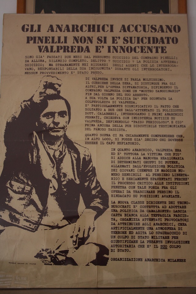 Το απόγευμα, αμέσως μετά τη φρικιαστική έκρηξη βόμβας στην Πιάτσα Φοντάνα, ο Καλαμπρέζι(1) έφτασε στον Όμιλο της Βία Σκαλντασόλε (2) και ζήτησε από τον αναρχικό Giuseppe Pinelli να τον ακολουθήσει στο τμήμα. Στο αρχηγείο, ο Pinelli συνάντησε πολλούς αναρχικούς του Μιλάνο. Όπως κι αυτός, είχαν κληθεί για ανάκριση για τα άλλοθί τους. Μέσα σε 48 ώρες, που ήταν και ο μέγιστος χρόνος κράτησης σε τμήμα για την εποχή, αυτοί που συνελήφθησαν αφέθηκαν ελεύθεροι και λίγοι μεταφέρθηκαν στις φυλακές. Ο Pinelli κρατήθηκε στο αρχηγείο για ανάκριση περισσότερο απ’ ότι επέτρεπε ο νόμος. Την 3η μέρα κράτησής του, στις 12 παρά 3 τη νύχτα, η Διοίκηση της Αστυνομίας του Μιλάνου καλεί ασθενοφόρο. Στις 12 και 2, περαστικός δημοσιογράφος βλέπει να ρίχνεται στην αυλή του κτιρίου από το 4ο πάτωμα ο Pinelli.