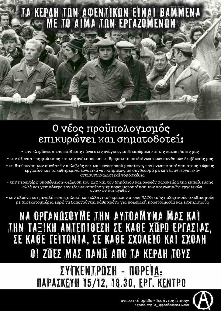 Συγκέντρωση-Πορεία: Παρασκευή 15/12, 18.30 στο Εργατικό Κέντρο