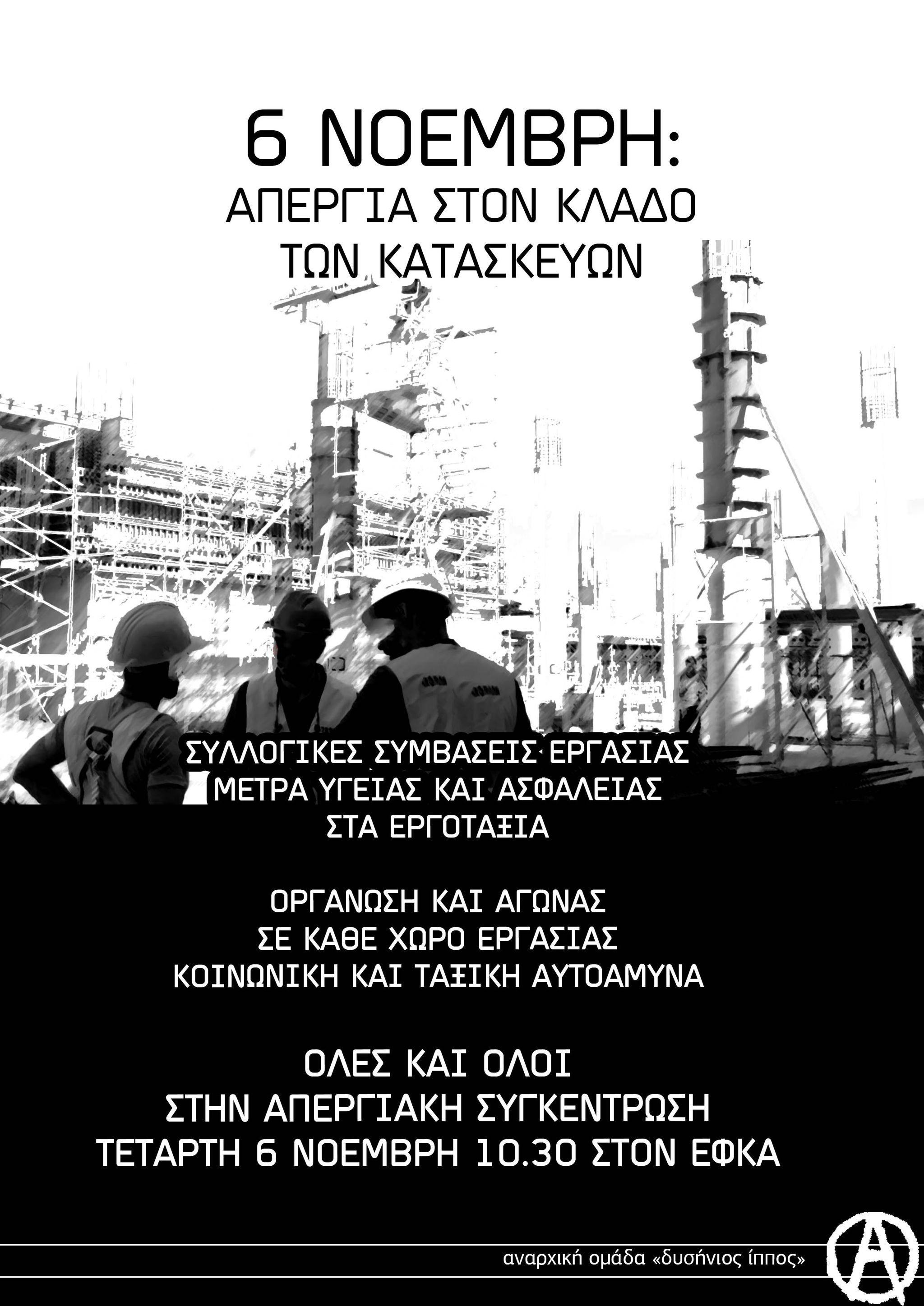 Την Τετάρτη 6 Νοέμβρη έχει κηρυχθεί απεργία στον κλάδο των κατασκευών από τα σωματεία του κλάδου.
