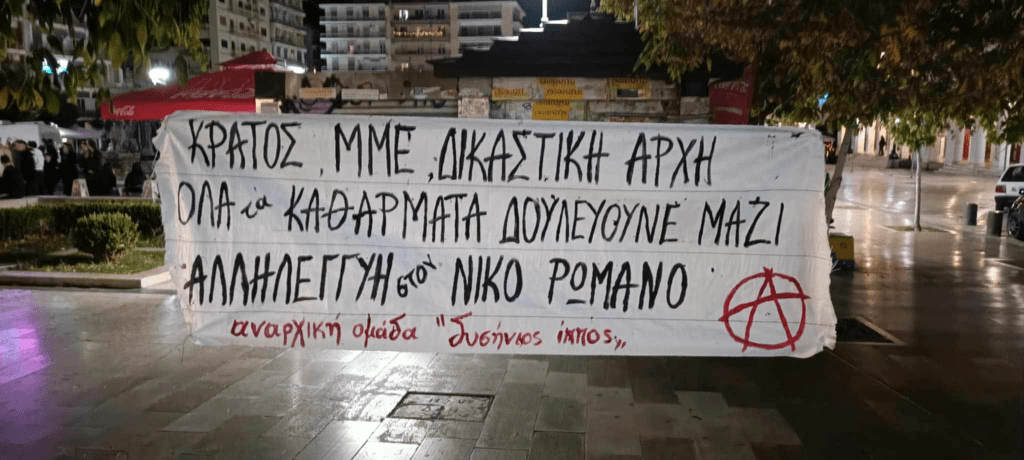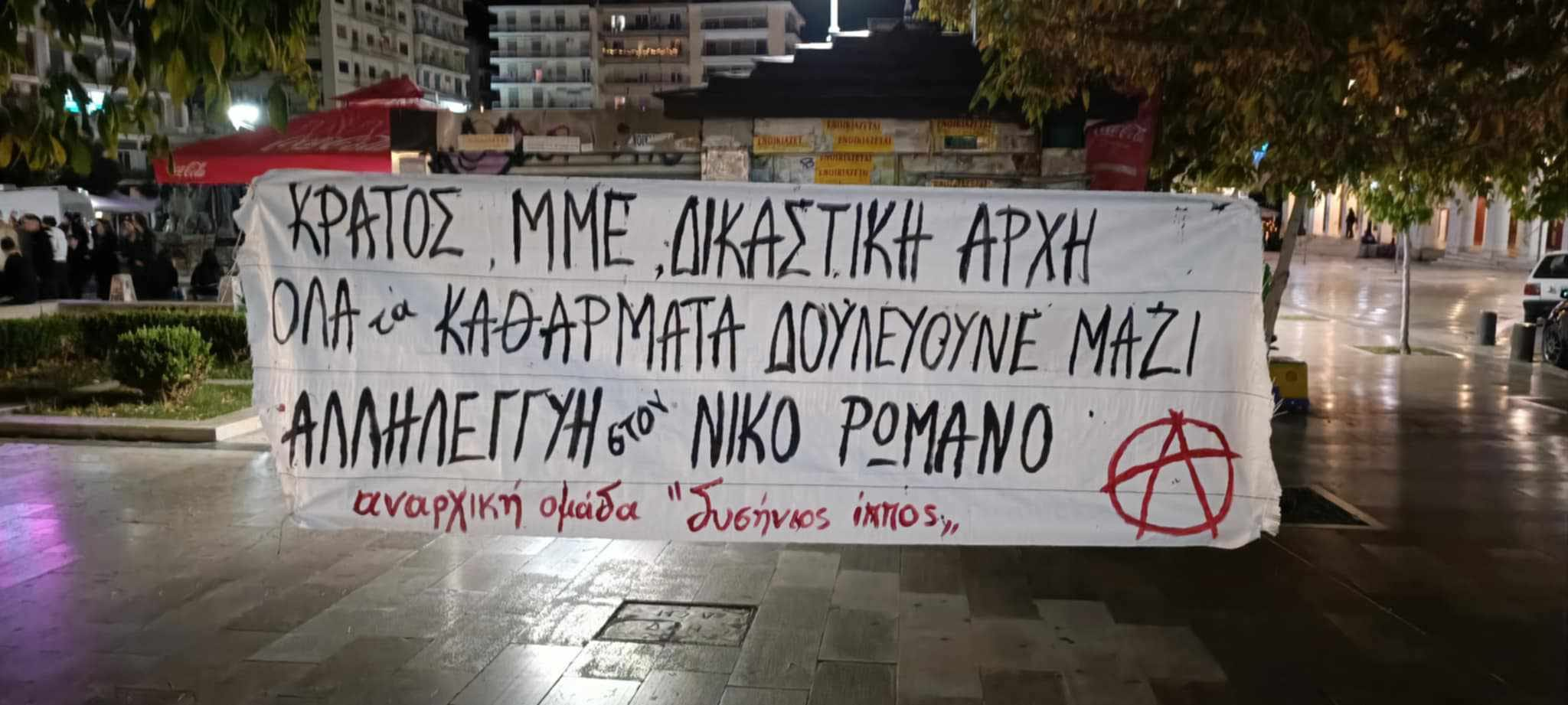 [Πάτρα] πανό αλληλεγγύης από την Αναρχική ομάδα “δυσήνιος ίππος” στο Νίκο Ρωμανό που προφυλακίστηκε σήμερα μετά από την επισφράγιση από τις δικαστικές αρχές μιας ακόμα κρατικής/αστυνομικής σκευωρίας σε βάρος ενός αναρχικού αγωνιστή.