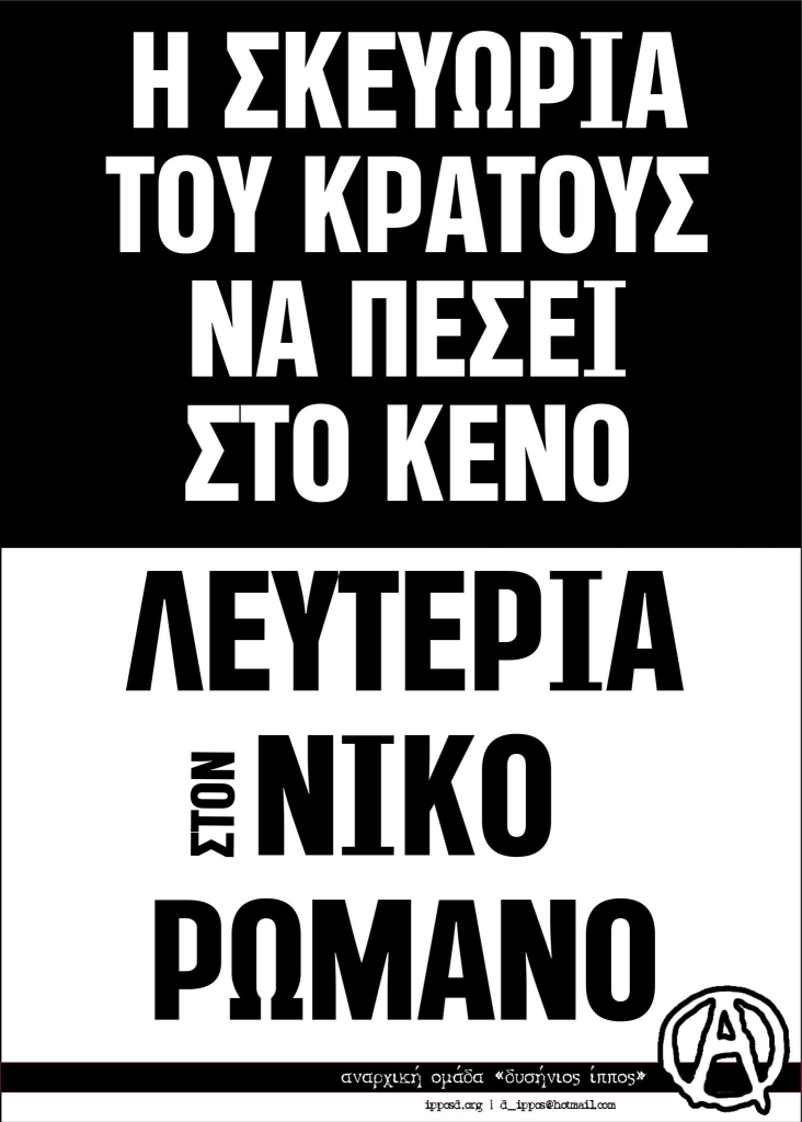 Αφίσα που κολλιέται αυτές τις μέρες στην Πάτρα σε ένδειξη αλληλεγγύης στον αγωνιστή Νίκο Ρωμανό που προφυλακίστηκε την Παρασκευή 22/11 μετά από την επισφράγιση από τις δικαστικές αρχές μιας ακόμα κρατικής/αστυνομικής σκευωρίας σε βάρος ενός αναρχικού αγωνιστή.
