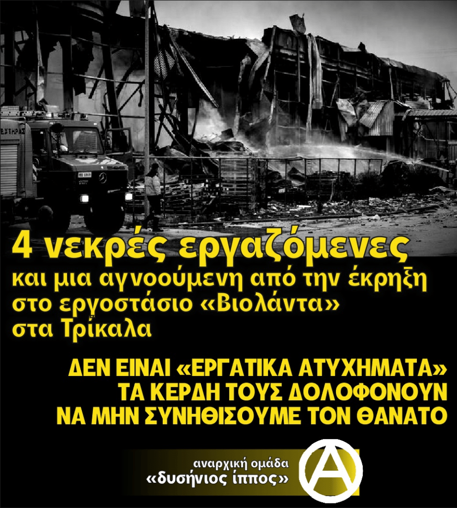 5 νεκρές εργαζόμενες από την έκρηξη στο εργοστάσιο “Βιολάντα” στα Τρίκαλα ΔΕΝ ΕΙΝΑΙ “ΕΡΓΑΤΙΚΑ ΑΤΥΧΗΜΑΤΑ” ΤΑ ΚΕΡΔΗ ΤΟΥΣ ΔΟΛΟΦΟΝΟΥΝ ΝΑ ΜΗΝ ΣΥΝΗΘΙΣΟΥΜΕ ΤΟΝ ΘΑΝΑΤΟ Share this: Share on Facebook (Opens in new window) Facebook Share on X (Opens in new window) X Like Loading... Related