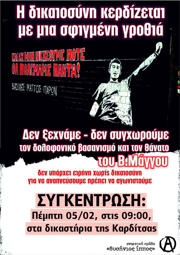 Δεν ξεχνάμε – δεν συγχωρούμε τον δολοφονικό βασανισμό και τον θάνατο του Β.Μάγγου Η δικαιοσύνη κερδίζεται με μια σφιγμένη γροθιά Συγκέντρωση: Πέμπτη 5/2 στις 9 στα δικαστήρια Καρδίτσας Share this: Share on Facebook (Opens in new window) Facebook Share on X (Opens in new window) X Like Loading... Related