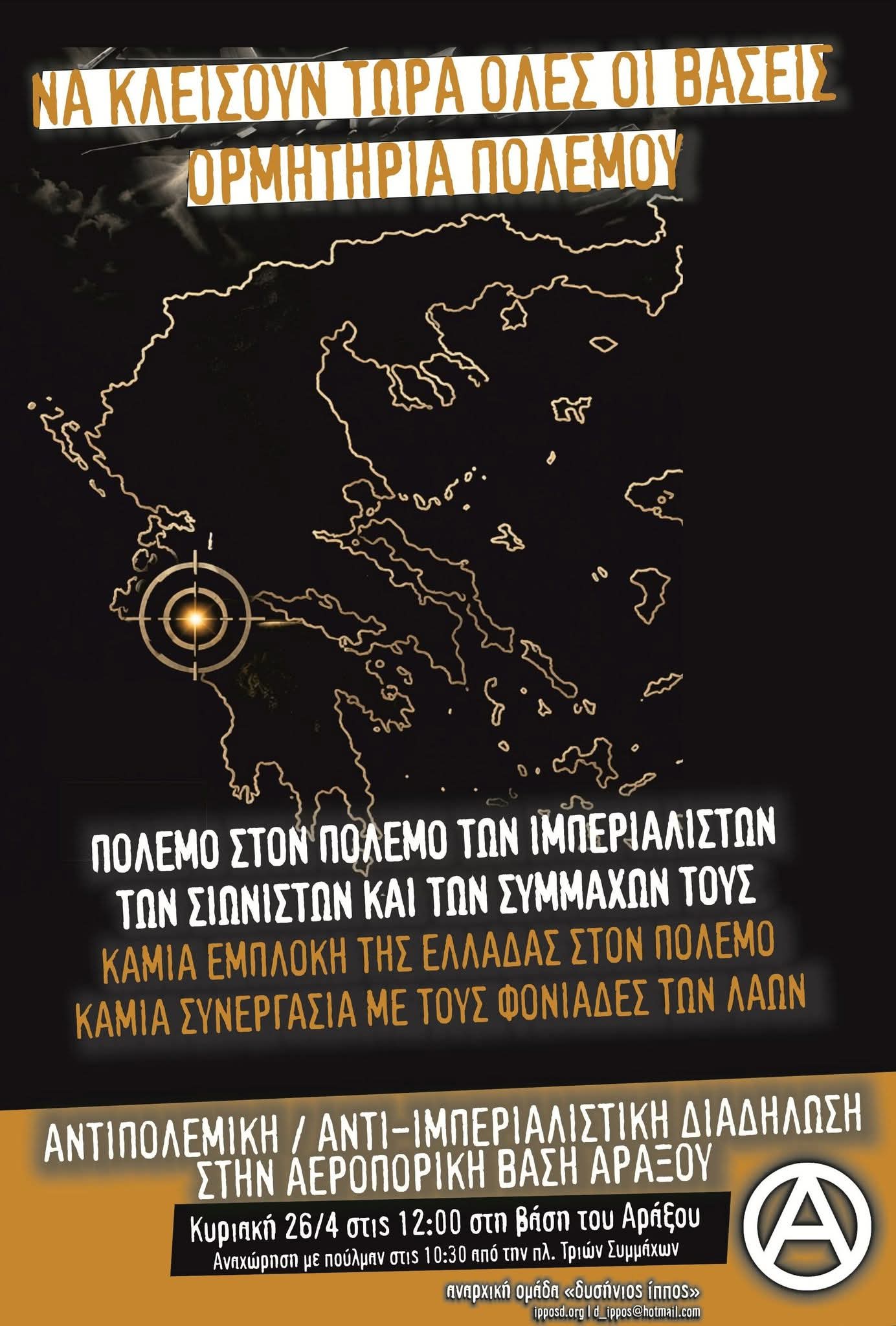ΑΝΤΙΠΟΛΕΜΙΚΗ / ΑΝΤΙ-ΙΜΠΕΡΙΑΛΙΣΤΙΚΗ ΔΙΑΔΗΛΩΣΗ ΣΤΗΝ ΑΕΡΟΠΟΡΙΚΗ ΒΑΣΗ ΤΟΥ ΑΡΑΞΟΥ ΚΥΡΙΑΚΗ 26/4: 12.00 στη βάση του Αράξου