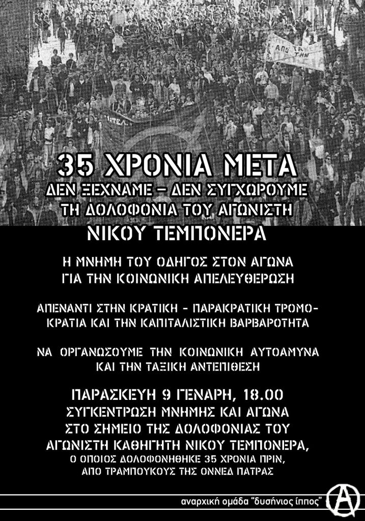 Παρασκευή 9 ΓΕΝΑΡΗ, 18.00 ΣΥΓΚΕΝΤΡΩΣΗ μνήμης και αγώνα στο σημείο της δολοφονίας του αγωνιστή καθηγητή Νίκου Τεμπονέρα, ο οποίος δολοφονήθηκε 35 χρόνια πριν, από τραμπούκους της ΟΝΝΕΔ Πάτρας