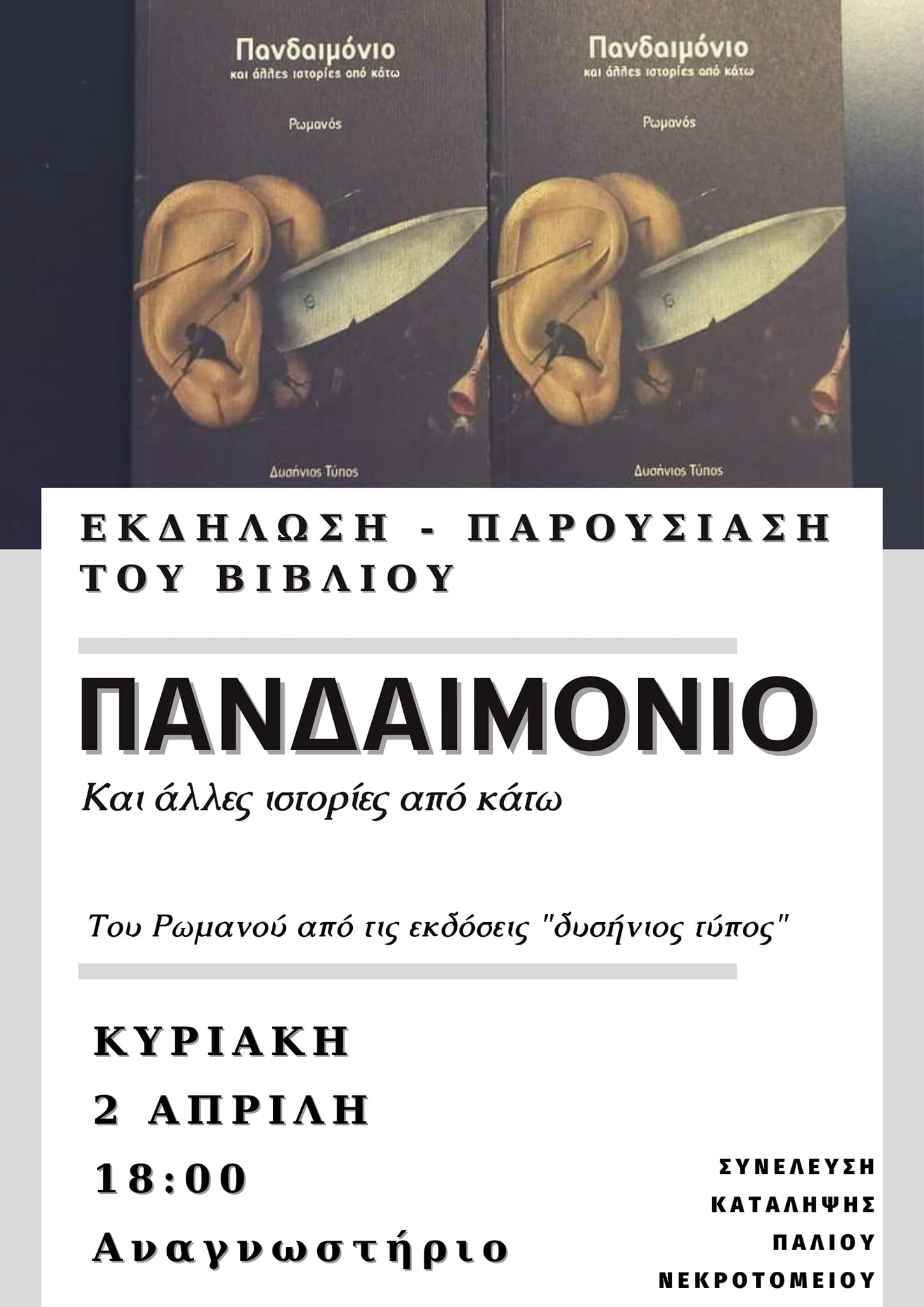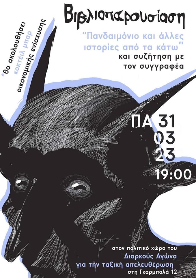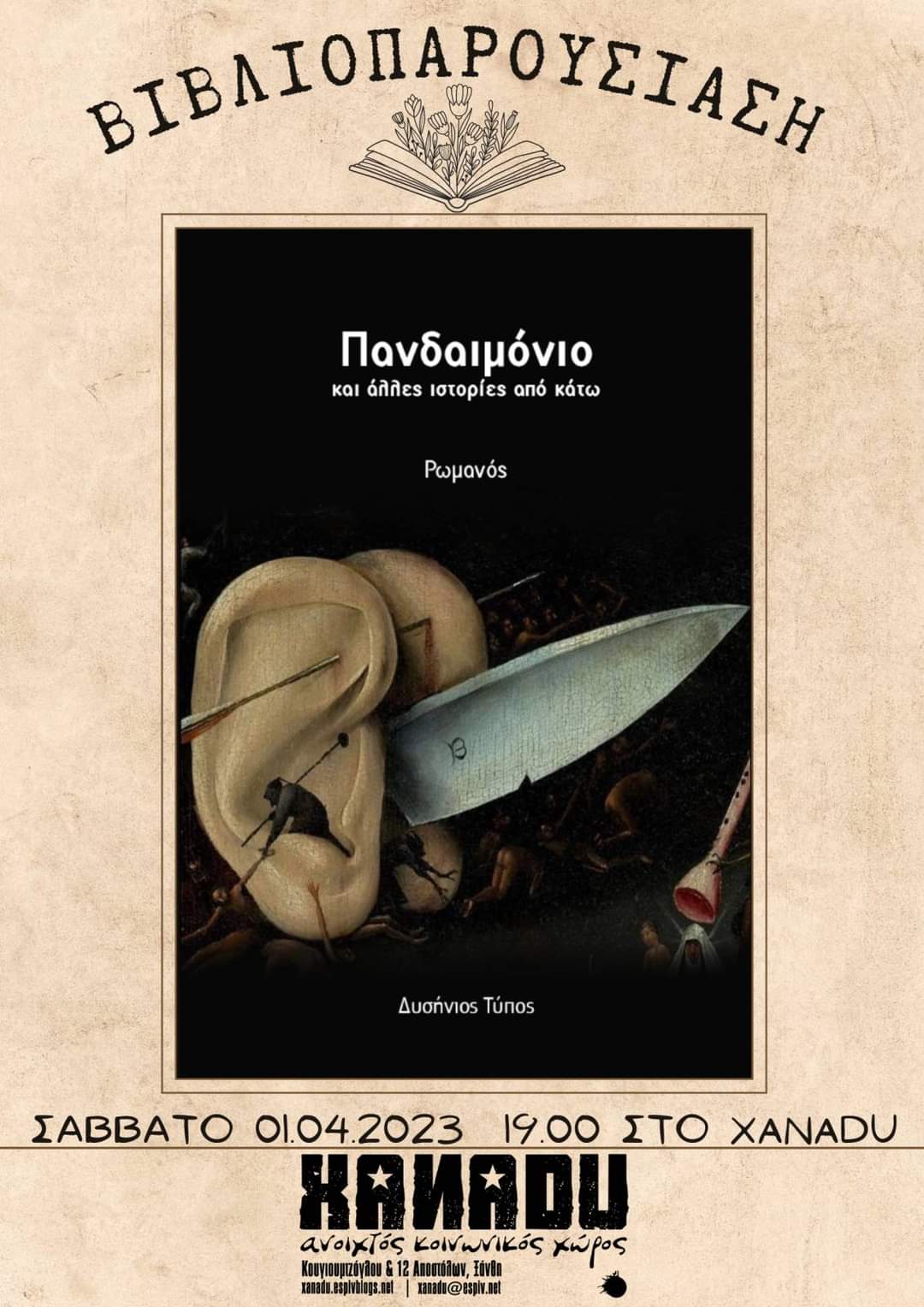 Το τριήμερο 31/3-1/4-2/4 πραγματοποιήθηκαν παρουσιάσεις του βιβλίου «Πανδαιμόνιο και άλλες ιστορίες από κάτω» (εκδόσεις Δυσήνιος Τύπος) σε Θεσσαλονίκη, Ξάνθη και Αλεξανδρούπολη.