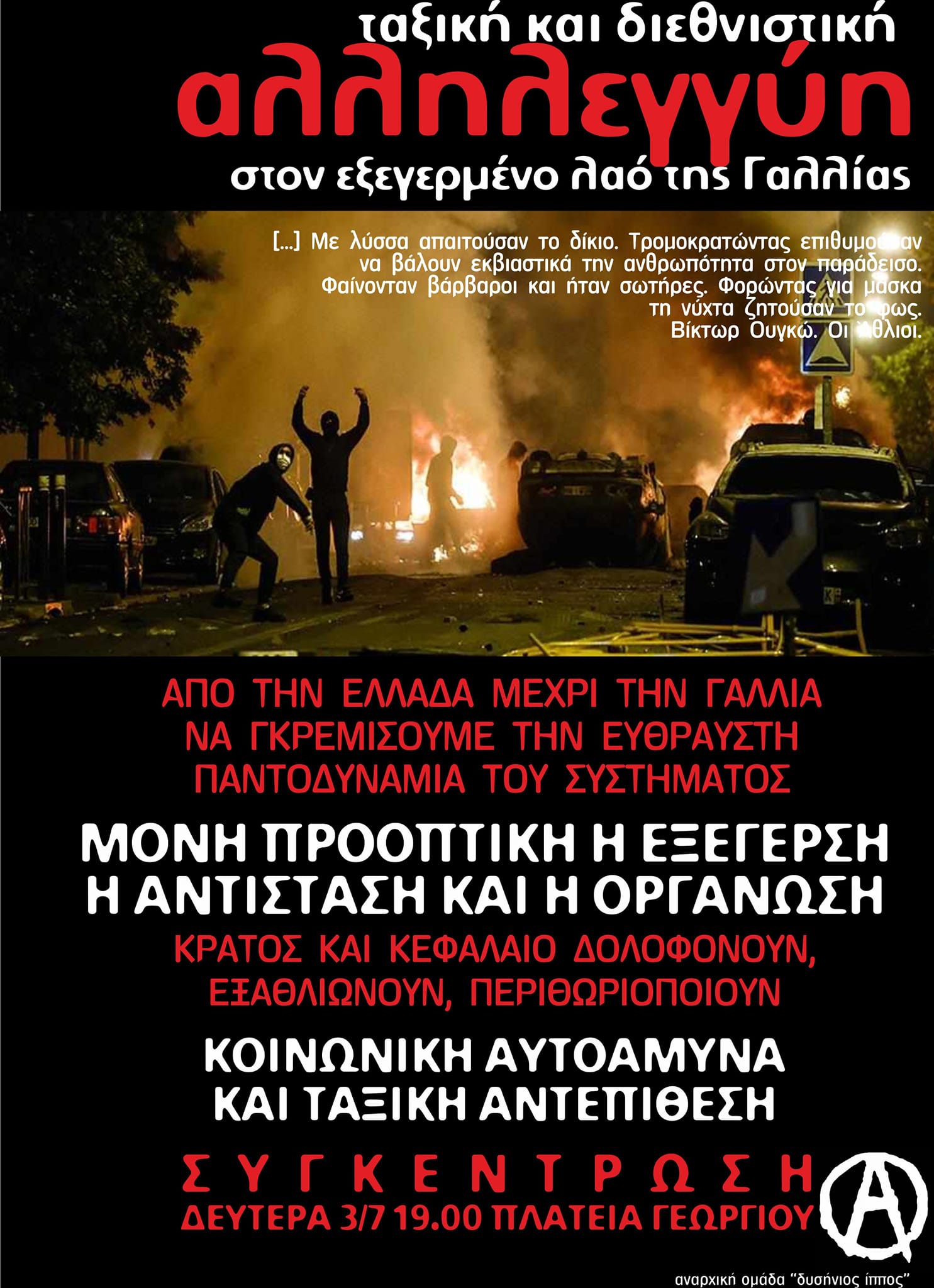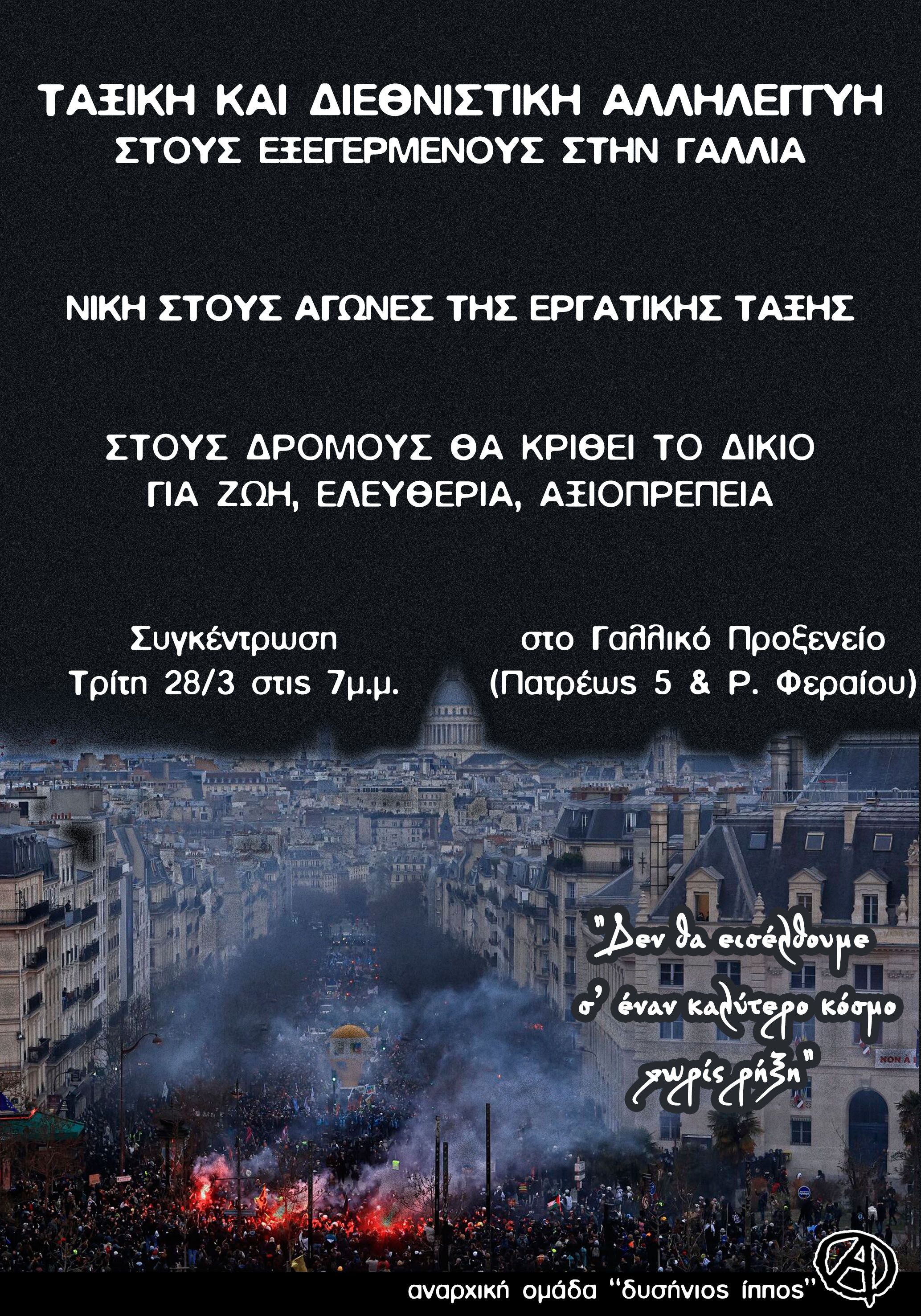 Από την πλευρά μας, ως αναρχικοί εκφράζουμε την αλληλεγγύη μας στα ταξικά μας αδέρφια στη Γαλλία. Στους εργαζόμενους, τους άνεργους, τους επισφαλείς και τους νεολαίους που εξεγείρονται ενάντια στην καπιταλιστική αναδιάρθρωση και την κρατική καταστολή. Κάθε προσπάθεια κράτους και κεφαλαίου να συντρίψουν τις κοινωνικές και ταξικές αντιστάσεις και να πάρουν πίσω κεκτημένα αιώνων που έχουν κερδηθεί με μακρόχρονους αγώνες και χυμένο αίμα, θα αντιμετωπίσει τη συσσωρευμένη λαϊκή οργή και την οργανωμένη αντεπίθεση της κοινωνικής πλειοψηφίας. Είναι χρέος μας να μην επιτρέψουμε τη διαιώνιση του παρασιτικού εξουσιαστικού status quo, χρέος μας να εξαπλώνουμε τη φλόγα της εξέγερσης και της διεθνιστικής αλληλεγγύης σε ολόκληρο τον κόσμο. Μέχρι το τέλος της εκμετάλλευσης ανθρώπου από άνθρωπο, το γκρέμισμα της κρατικής και καπιταλιστικής βαρβαρότητας, μέχρι την κοινωνική επανάσταση.