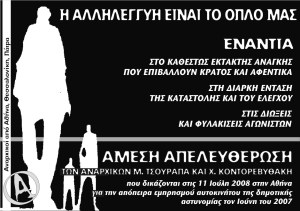 Αυτοκόλλητο που κυκλοφόρησε από συντρόφους στην Πάτρα τον Απρίλη του 2010 και κολλήθηκε σε διάφορες περιοχές της χώρας. Ο σύντροφος Λάμπρος Φούντας δολοφονήθηκε από τα ένστολα σκυλιά του κράτους στις 10 Μάρτη 2010 στην περιοχή της Δάφνης στην Αθήνα. Ο Λάμπρος ήταν ένας από μας. Η μνήμη του θα ζεί στους αγώνες μας!