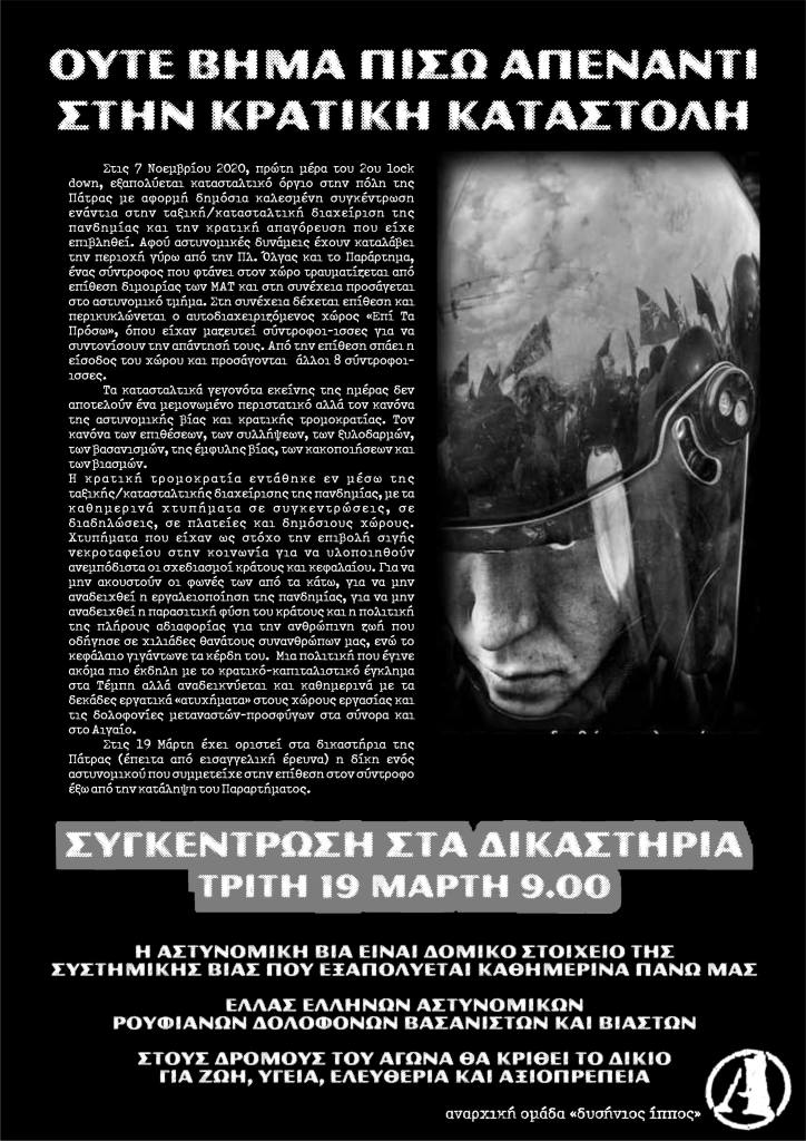 Στις 7 Νοεμβρίου 2020, πρώτη μέρα του 2ου lock down, εξαπολύεται κατασταλτικό όργιο στην πόλη της Πάτρας με αφορμή δημόσια καλεσμένη συγκέντρωση ενάντια στην ταξική/κατασταλτική διαχείριση της πανδημίας και την κρατική απαγόρευση που είχε επιβληθεί. Αφού αστυνομικές δυνάμεις έχουν καταλάβει την περιοχή γύρω από την Πλ. Όλγας και το Παράρτημα, ένας σύντροφος που φτάνει στον χώρο τραυματίζεται από επίθεση διμοιρίας των ΜΑΤ και στη συνέχεια προσάγεται στο αστυνομικό τμήμα. Στη συνέχεια δέχεται επίθεση και περικυκλώνεται ο αυτοδιαχειριζόμενος χώρος «Επί Τα Πρόσω», όπου είχαν μαζευτεί σύντροφοι-ισσες για να συντονίσουν την απάντησή τους. Από την επίθεση σπάει η είσοδος του χώρου και προσάγονται άλλοι 8 σύντροφοι-ισσες.