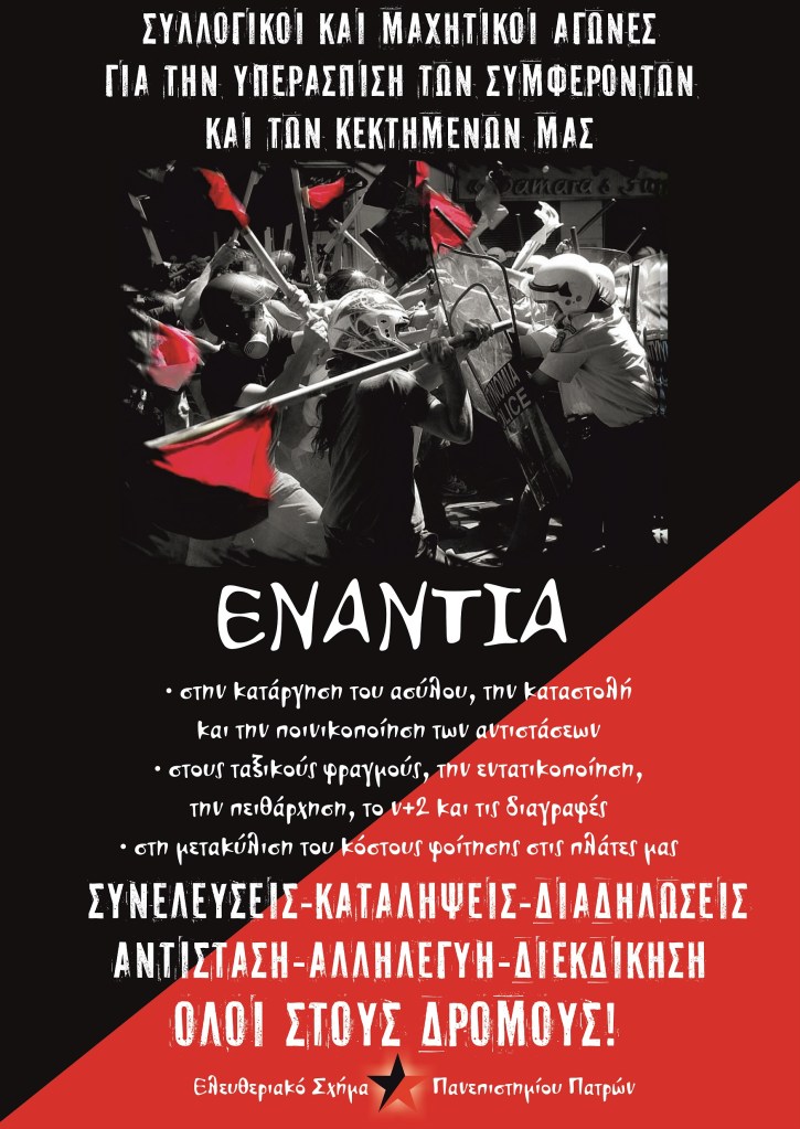Κοινή αφίσα από Ελευθεριακό Σχήμα Πανεπιστημίου Πατρών, Αυτόνομο Σχήμα Πολυτεχνικής Ξάνθης, Ελευθεριακό Σχήμα Ιατρικής Αλεξανδρούπολης – GYRA NEGRA, Ελευθεριακό Σχήμα Φιλοσοφικής ΑΠΘ, Φερμα-σχήμα στο Μαθηματικό ΑΠΘ, Αυτόνομο Σχήμα Πληροφορικής ΑΠΘ, Αυτόνομο Σχήμα Φυσικού ΑΠΘ, Αυτόνομο Σχήμα Ηλεκτρολόγων ΕΜΠ, Ελευθεριακό Σχήμα Πανεπιστημίου Δυτικής Αττικής, Ελευθεριακό Σχήμα Πολυτεχνείου Κρήτης, Ελευθεριακό Σχήμα Πα.Μακ