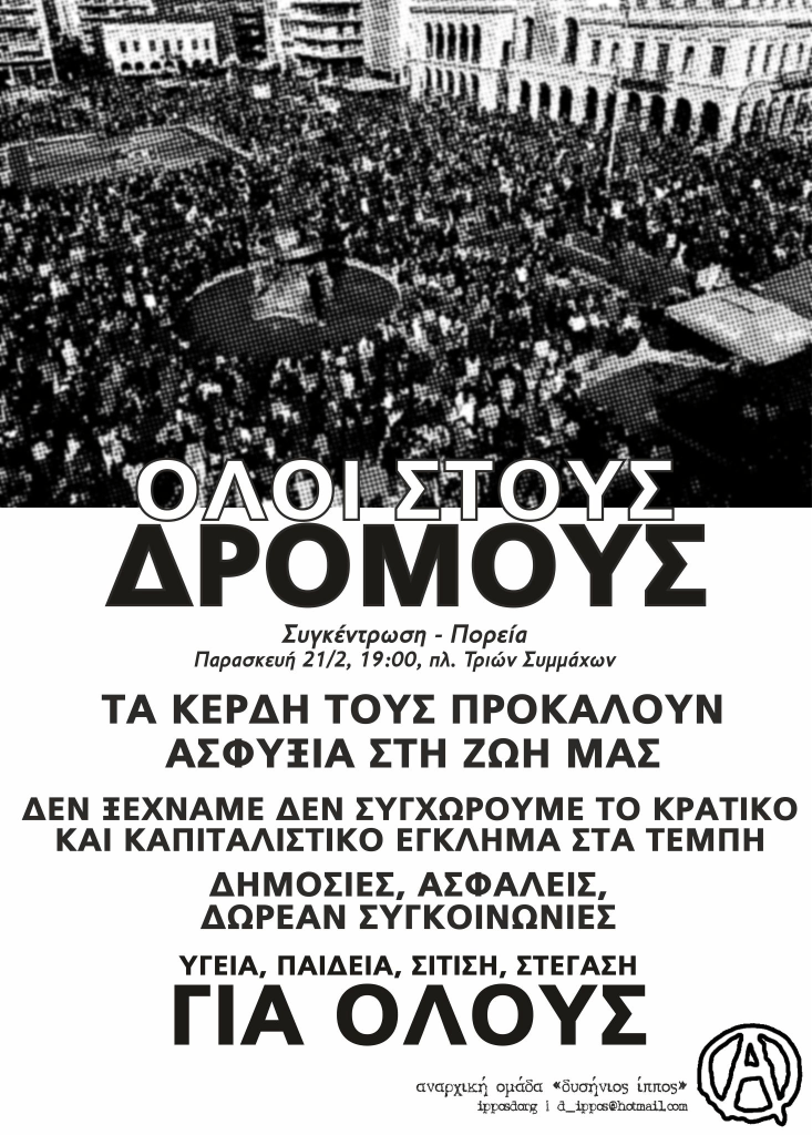 [ΠΑΤΡΑ] ΠΑΡΑΣΚΕΥΗ 21 ΦΛΕΒΑΡΗ: ΣΥΓΚΕΝΤΡΩΣΗ ΣΤΗΝ ΠΛΑΤΕΙΑ ΤΡΙΩΝ ΣΥΜΜΑΧΩΝ ΣΤΙΣ 19:00 ΚΑΙ ΠΟΡΕΙΑ ΠΡΟΣ ΤΟΝ ΟΣΕ ΣΤΗΝ ΟΘ. ΑΜΑΛΙΑΣ