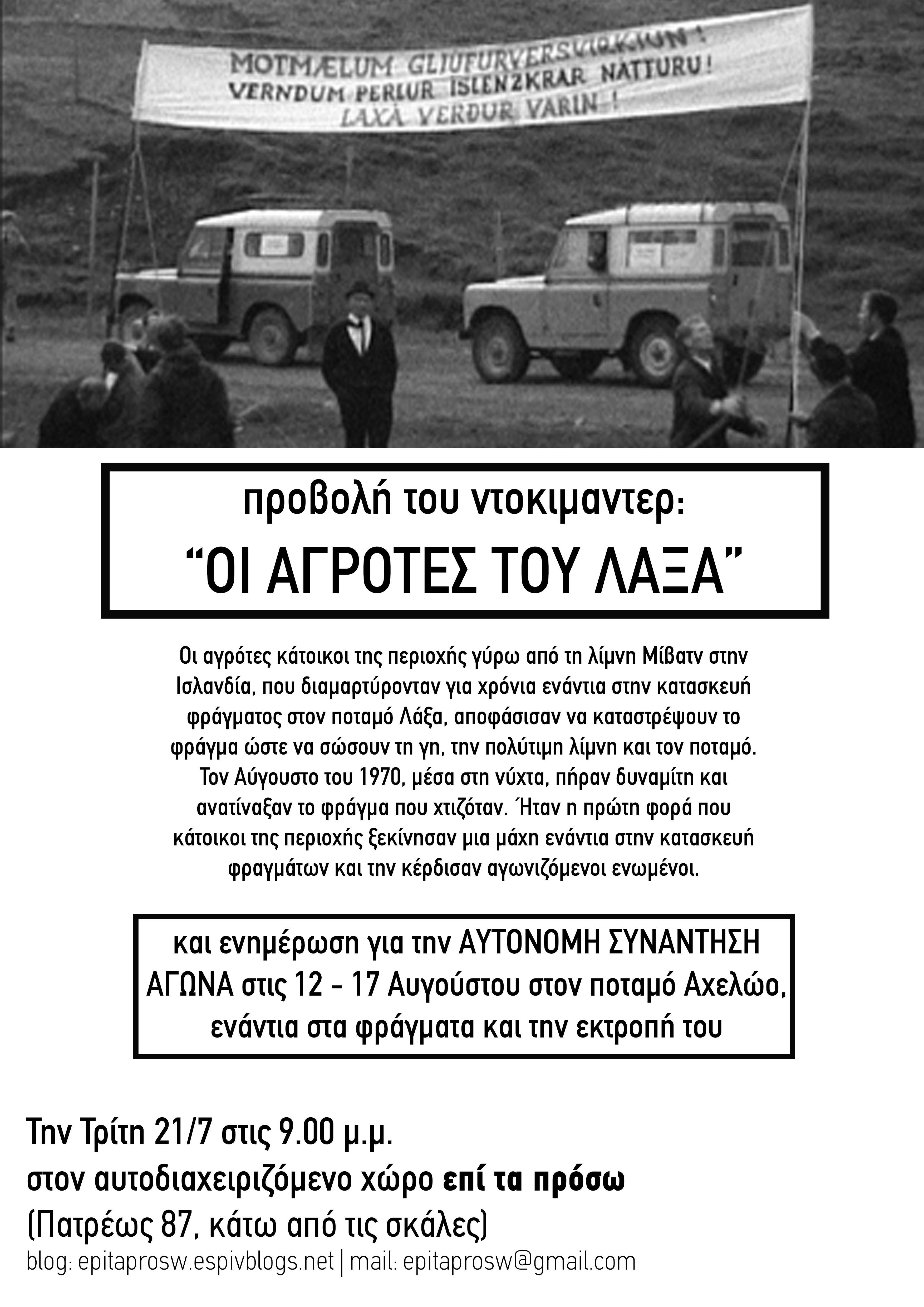 Προβολή του ντοκιμαντέρ: ΟΙ ΑΓΡΟΤΕΣ ΤΟΥ ΛΑΞΑ και ενημέρωση για την ΑΥΤΟΝΟΜΗ ΣΥΝΑΝΤΗΣΗ ΑΓΩΝΑ στις 12 – 17 Αυγούστου στον ποταμό Αχελώο