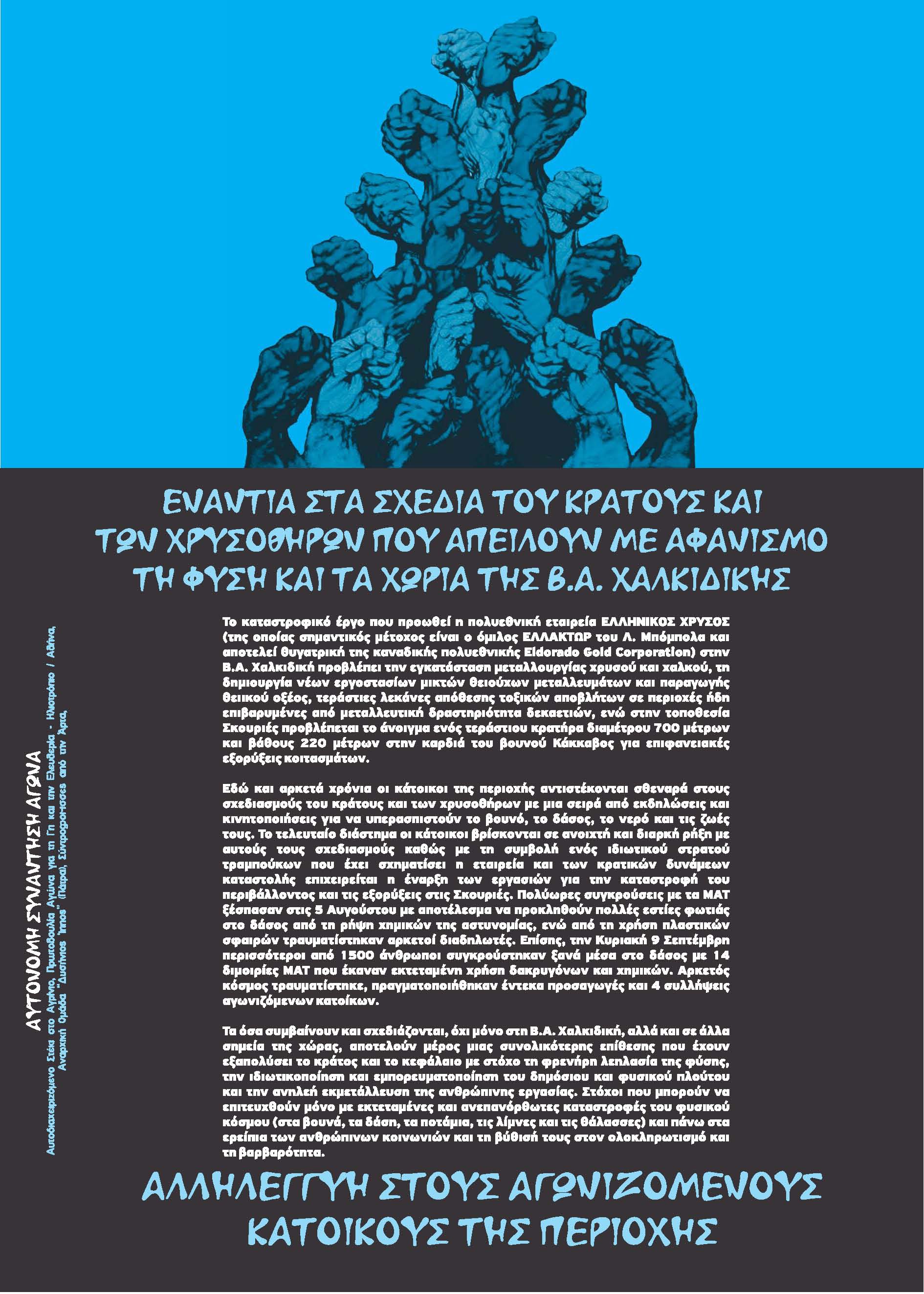 Σε αυτή τη δεδομένη και ολοένα εντεινόμενη επίθεση του κράτους και του καπιταλισμού απέναντι στη φύση και την κοινωνία, ο αγώνας θα πρέπει, για να έχει ελπίδες όξυνσης και διασύνδεσης, να είναι κινηματικός, μαχητικός, οριζόντιος και εξωστρεφής. Να μην αρκείται σε μια στείρα τοπική ανάγνωση του ζητήματος, αλλά να έχει αντίληψη πως αντίστοιχες επιθέσεις συμβαίνουν σε διάφορες περιοχές της χώρας (από τις Σκουριές ως το Αποπηγάδι και από την Πάρνηθα ως τον Αμβρακικό) και πως το ζητούμενο για όσους αντιστέκονται είναι η σύνδεση και η ενότητα στη δράση απέναντι στην κοιτίδα της καταστροφής και της λεηλασίας του φυσικού κόσμου, του αφανισμού των τοπικών κοινωνιών, της εξαθλίωσης και της φτώχειας της συντριπτικής πλειοψηφίας των ανθρώπων, δηλαδή στον καπιταλισμό και το κράτος.