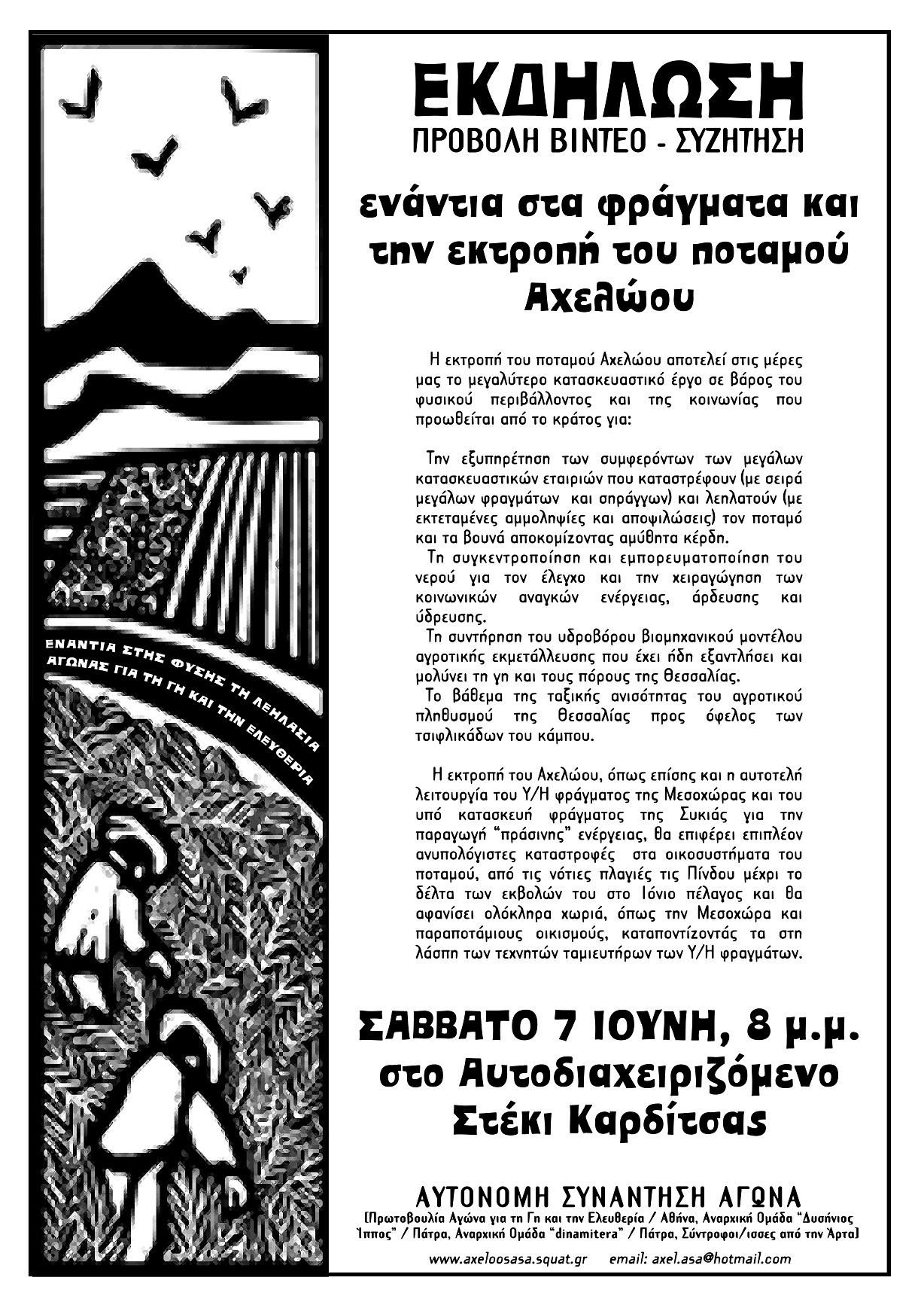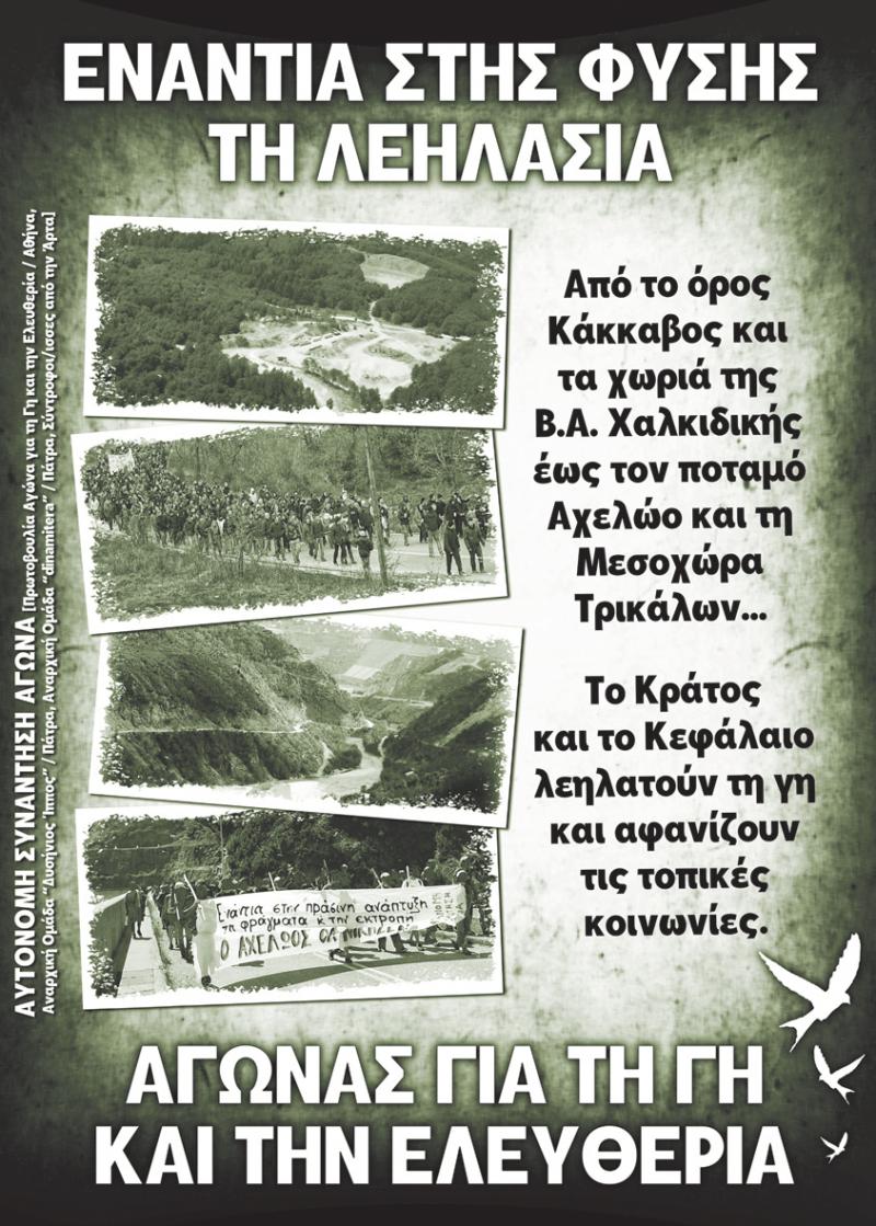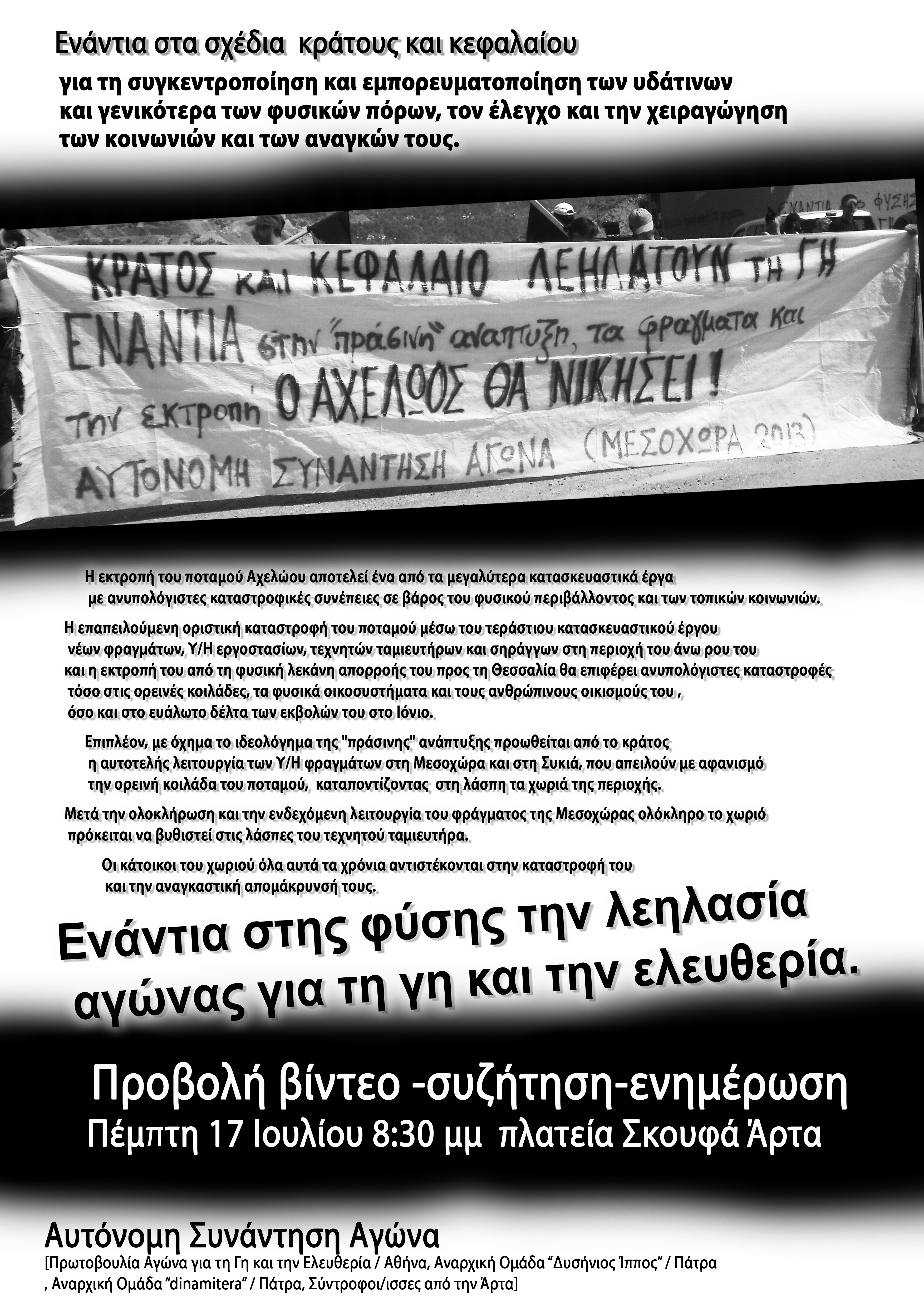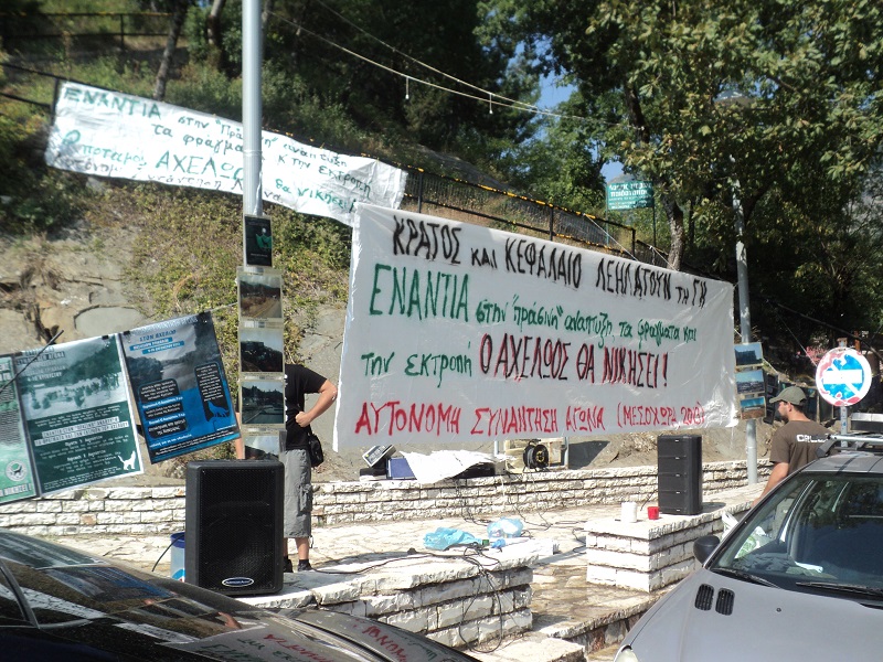 Από τη μεριά μας, επιζητώντας τη ριζοσπαστικοποίηση, την όξυνση, τη γενίκευση και το συντονισμό του κοινωνικού αγώνα από τα κάτω, στεκόμαστε αλληλέγγυοι πλάι σε όλους όσοι αγωνίζονται συλλογικά ενάντια στη λεηλασία της φύσης. Και θεωρούμε την αγωνιστική παρουσία μας στο χώρο όπου διαπράττεται το έγκλημα των φραγμάτων και της εκτροπής απαραίτητη και χρήσιμη για την εξέλιξη και την ανάπτυξη τόσο του αγώνα για την προάσπιση του Αχελώου και των τοπικών κοινωνιών στον άνω ρου του, όσο και για την προάσπιση του φυσικού κόσμου και της κοινωνίας συνολικότερα.