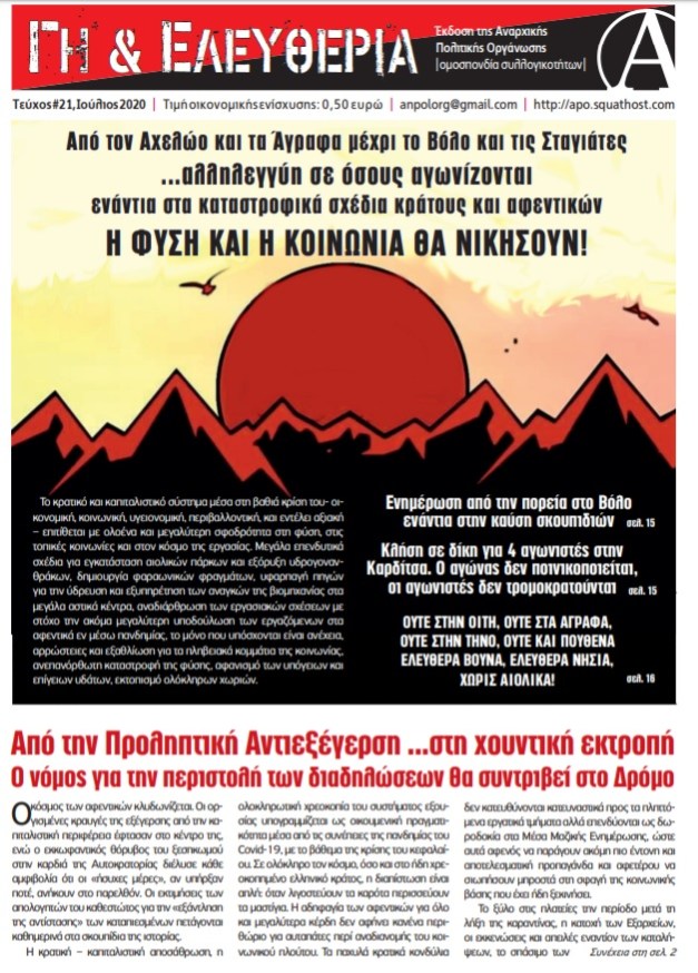 Κυκλοφόρησε το 21ο τεύχος του εντύπου της Αναρχικής Πολιτικής Οργάνωσης “Γη και Ελευθερία” Μπορείτε να το δείτε σε pdf εδώ Θα το βρείτε σε αυτοδιαχειριζόμενους χώρους, στέκια και καταλήψεις, καθώς και στους δρόμους του αγώνα. Από τον Αχελώο και τα Άγραφα μέχρι το Βόλο και τις Σταγιάτες …αλληλεγγύη σε όσους αγωνίζονται ενάντια στα καταστροφικά σχέδια κράτους και αφεντικών Η ΦΥΣΗ ΚΑΙ Η ΚΟΙΝΩΝΙΑ ΘΑ ΝΙΚΗΣΟΥΝ!