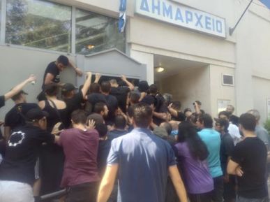 Επίσης, στις 22 Αυγούστου, ημέρα που ήταν προγραμματισμένη η συνεδρίαση της οικονομικής επιτροπής για την επικύρωση της δημοπρασίας ενοικίασης έκτασης του Δήμου στην εταιρεία των αιολικών πάνω από 100 αγωνιστές και αγωνίστριες συγκεντρώθηκαν έξω από το δημαρχείο και στη συνέχεια επιχείρησαν να μπουν σε αυτό ώστε να ματαιώσουν την προγραμματισμένη διαδικασία. Για ακόμα μια φορά βρέθηκαν αντιμέτωποι με τις αστυνομικές δυνάμεις οι οποίες απάντησαν με ξύλο και χημικά. Μετά την επίθεση της αστυνομίας, η συγκέντρωση ανασυγκροτήθηκε μπροστά στην είσοδο του δημαρχείου και το κρατούσε αποκλεισμένο για να μην μπουν μέσα τα υπολειπόμενα μέλη της οικονομικής επιτροπής και ξεκινήσει η διαδικασία. Μετά από κάποια ώρα και αφού έγινε γνωστό στους συγκεντρωμένους ότι η διαδικασία έχει ματαιωθεί εξαιτίας «συνθηκών ανωτέρας βίας» πραγματοποιήθηκε μαζική πορεία στο κέντρο της πόλης.