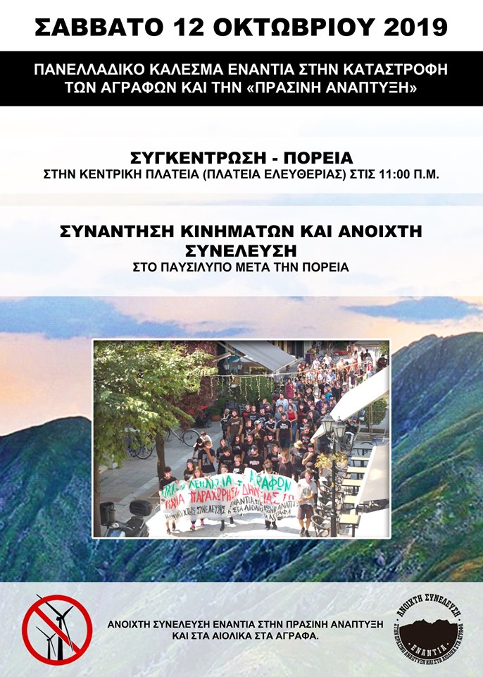 Εκδήλωση ενημέρωσης & συζήτησης με σύντροφο που συμμετέχει στον αγώνα ενάντια στα αιολικά στα Άγραφα,στην κατάληψη Λέλας Καραγιάννη 37 στην Αθήνα την Παρασκευή 11 Οκτώβρη 2019, 19:00