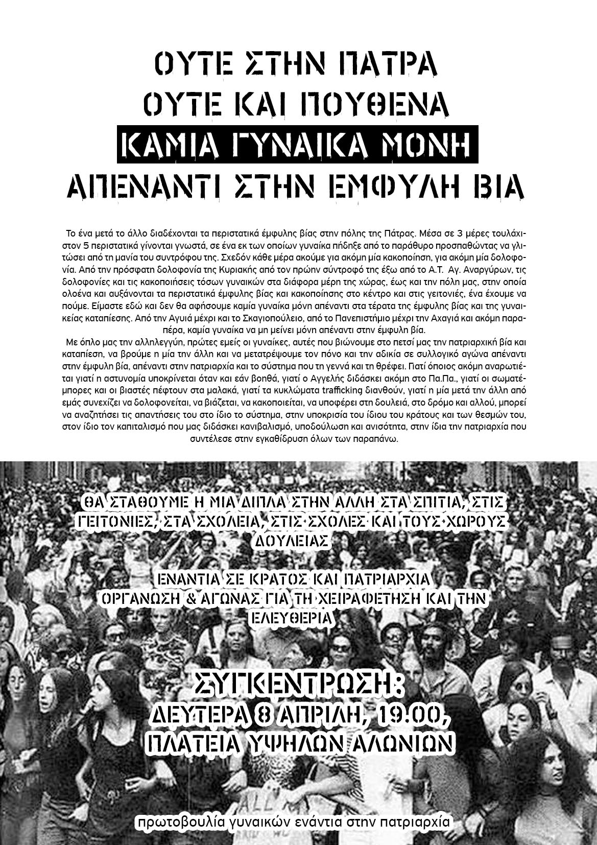 ΣΥΓΚΕΝΤΡΩΣΗ ΕΝΑΝΤΙΑ ΣΤΗΝ ΕΜΦΥΛΗ ΒΙΑ: ΔΕΥΤΕΡΑ 8 ΑΠΡΙΛΗ, 19:00, ΠΛ. ΥΨΗΛΩΝ ΑΛΩΝΙΩΝ