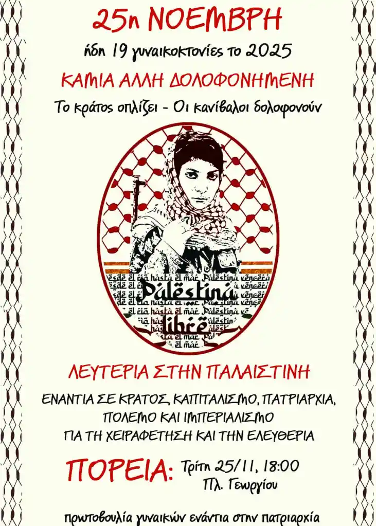 Η φετινή 25η Νοέμβρη μας βρίσκει αντιμέτωπες με ήδη 13 δολοφονημένες γυναίκες για το 2024. Η Γαρυφαλλιά έχασε την ζωή της λίγες μέρες πριν στην πόλη μας, έπειτα από τον ξυλοδαρμό της έξω από ξενοδοχείο στην Τερψιθέα από τον πρώην σύντροφό της. Η Δώρα, μητέρα τριών παιδιών, δολοφονείται στο Αγρίνιο με πυροβολισμό από τον πρώην σύντροφό της. Η Γεωργία, έγκυος τριών μηνών στο δεύτερό της παιδί, δολοφονήθηκε με μαχαίρι κουζίνας από τον σύντροφό της και έναν φίλο του στο σπίτι της στην Καλαμαριά. Η Κυριακή, δολοφονείται με μαχαίρι από τον πρώην σύντροφό της έξω από το Αστυνομικό Τμήμα Αγίων Αναργύρων μπροστά στα μάτια των αστυνομικών και ενώ είχε απευθυνθεί για προστασία. Η Ενκελέιντα δολοφονείται στο Μενίδι με περισσότερες από 10 μαχαιριές από τον πρώην σύζυγό της. 11χρονη βρίσκεται δολοφονημένη σε χωράφια στην Ηλεία από τον 37χρονο θείο της, ο οποίος τη σκότωσε με κατσαβίδι, γιατί αντιστάθηκε στη σεξουαλική επίθεση που δέχτηκε. Έπειτα από διαπληκτισμό 50χρονος άνδρας περιέλουσε με πετρέλαιο και έβαλε φωτιά στη 45χρονη σύζυγό του μπροστά στα παιδιά τους στο Ζεφύρι. 29χρονη δολοφονείται από τον 39χρονο σύντροφό της με πυροβολισμό στο κεφάλι μέσα στο διαμέρισμα όπου διέμεναν στο Ηράκλειο της Κρήτης. 87χρονη δολοφονείται στη Θεσσαλονίκη με πολλαπλές μαχαιριές στην περιοχή της κοιλιάς από τον 80χρονο σύζυγό της, ενώ μάλιστα αναφέρθηκαν ακόμα και σημάδια από πιρούνι στο πρόσωπό της. 81χρονος σκοτώνει την 73χρονη σύζυγό του στην Αλεξανδρούπολη με πολλαπλά χτυπήματα με μαχαίρι. 43χρονος στήνει καρτέρι και σκοτώνει πυροβολώντας την 36χρονη εν διαστάσει σύζυγό του στην Αμφιλοχία. 67χρονος σκότωσε την 60χρονη σύζυγό του και στη συνέχεια αυτοκτόνησε σε χωριό της Λαμίας. Και η λίστα δε λέει να τελειώσει.