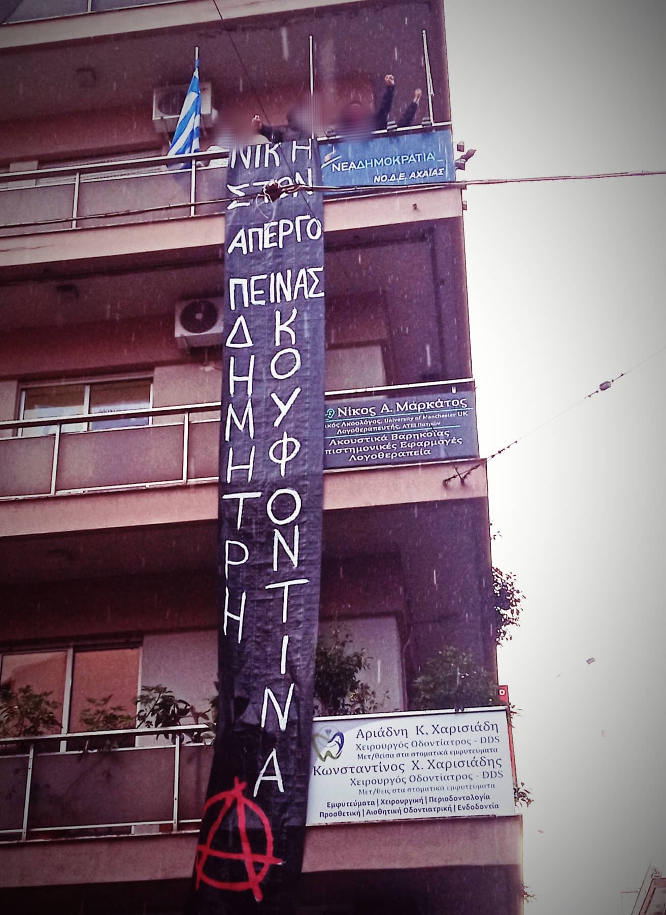 Την Δευτέρα 1/2 πραγματοποιήθηκε η προγραμματισμένη συγκέντρωση αλληλεγγύης στον αγωνιστή απεργό πείνας Δ. Κουφοντίνα. Ταυτόχρονα πραγματοποιήθηκε κατάληψη στα γραφεία της ΝΔ Αχαΐας, στη διάρκεια της οποία πραγματοποιήθηκαν 9 συλλήψεις συντρόφων και συντροφισσων.