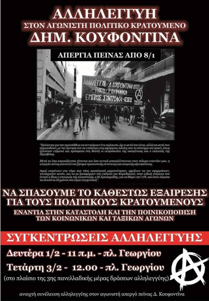 ΚΑΝΕΝΑΣ ΜΟΝΟΣ ΣΤΑ ΧΕΡΙΑ ΤΟΥ ΚΡΑΤΟΥΣ ΑΛΛΗΛΕΓΓΥΗ ΣΤΟΝ ΕΠΑΝΑΣΤΑΤΗ ΑΓΩΝΙΣΤΗ Δ. ΚΟΥΦΟΝΤΙΝΤΑ ΑΜΕΣΗ ΙΚΑΝΟΠΟΙΗΣΗ ΤΟΥ ΑΙΤΗΜΑΤΟΣ ΤΟΥ ΓΙΑ ΜΕΤΑΓΩΓΗ ΣΤΙΣ ΦΥΛΑΚΕΣ ΚΟΡΥΔΑΛΛΟΥ