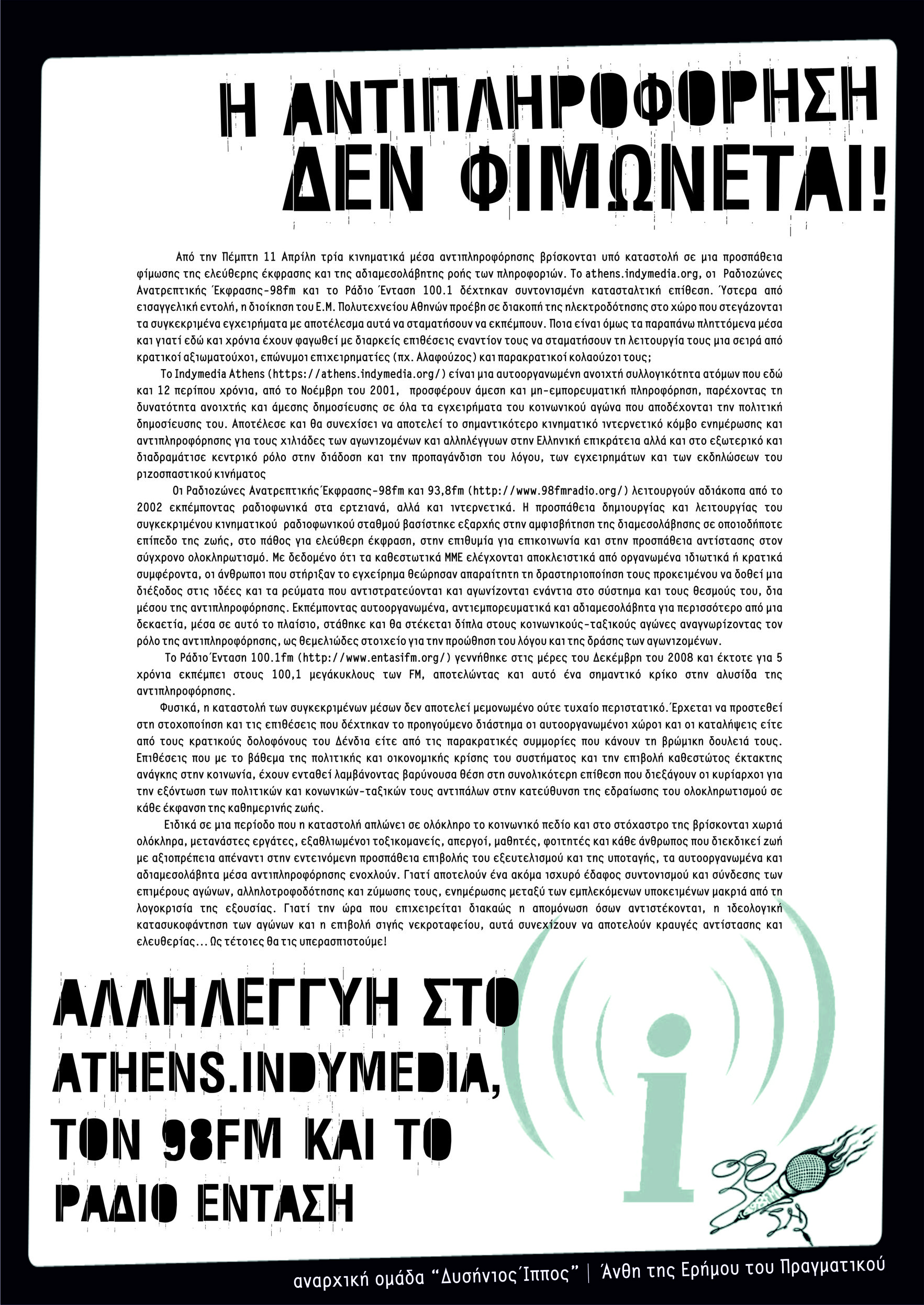 Μέσα στο πλαίσιο της διαρκώς εντεινόμενης προπαγάνδας των καθεστωτικών μέσων ενημέρωσης και της έντασης της ιδεολογικής και κατασταλτικής επίθεσης του κράτους απέναντι σε όσους αντιστέκονται, διαμορφώνουμε τα δικά μας εργαλεία ενημέρωσης και αναζήτησης, πολιτικού διαλόγου και ζύμωσης, με γνώμονα να φανούν χρήσιμα στους πραγματικούς κοινωνικούς αγώνες που πάντα εκβάλουν στο δρόμο, εκεί που ακόμα είναι όλα ανοιχτά!