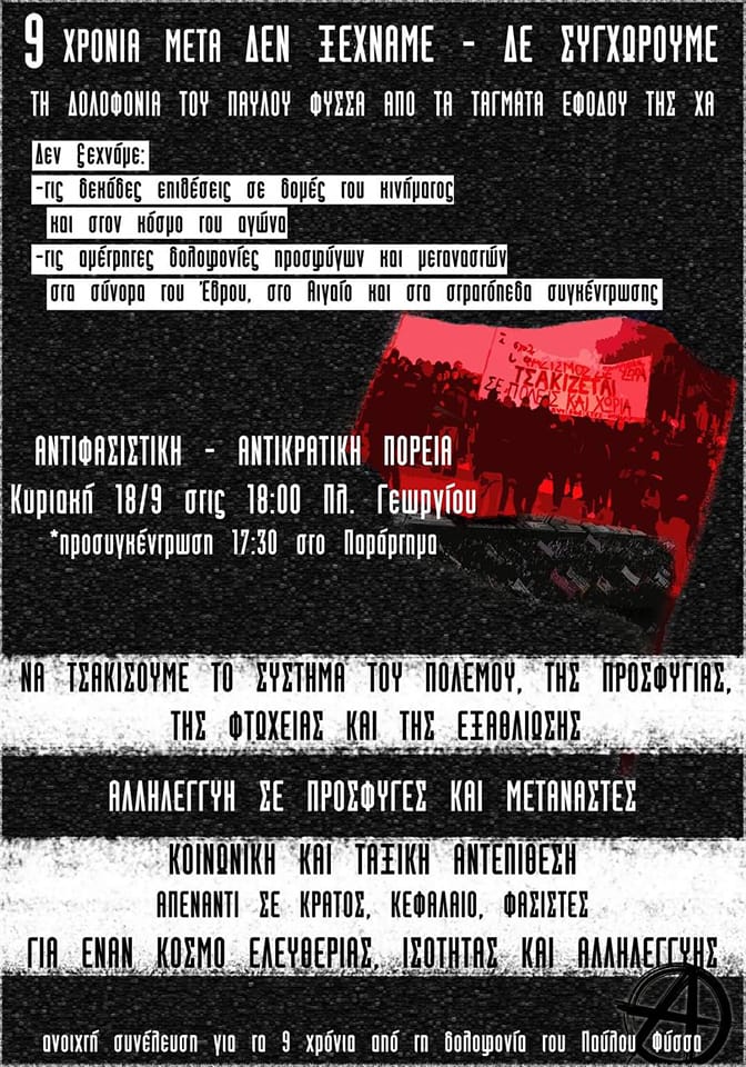 KΑΛΕΣΜΑ ΣΕ ΑΝΟΙΧΤΗ ΣΥΝΕΛΕΥΣΗ ΓΙΑ ΤΗ ΔΙΟΡΓΑΝΩΣΗ ΑΝΤΙΦΑΣΙΣΤΙΚΗΣ-ΑΝΤΙΚΡΑΤΙΚΗΣ-ΑΝΤΙΚΑΤΑΣΤΑΛΤΙΚΗΣ ΔΙΑΔΗΛΩΣΗΣ, 9 ΧΡΟΝΙΑ ΜΕΤΑ ΤΗ ΔΟΛΟΦΟΝΙΑ ΤΟΥ ΠΑΥΛΟΥ ΦΥΣΣΑ ΑΠΟ ΤΟΥΣ ΦΑΣΙΣΤΕΣ ΤΗΣ ΧΡΥΣΗΣ ΑΥΓΗΣ