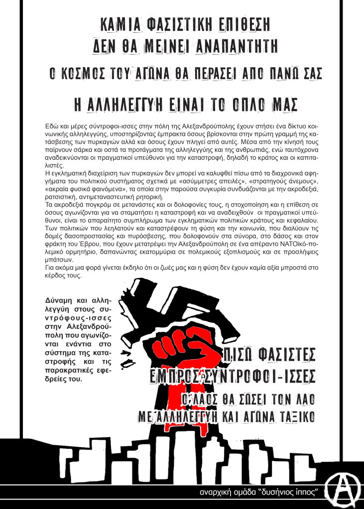 Continue reading “Γιατί η αντισημιτική ελληνική ακροδεξιά λατρεύει το Ισραηλινό κράτος;”Αφίσα για τις φασιστικές επιθέσεις στην Αλεξανδρούπολη
