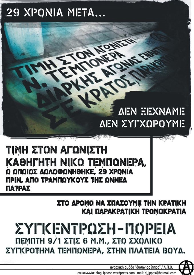Περισσότερα από 300 άτομα κατέβηκαν σήμερα στο δρόμο, στη συμπλήρωση 29 χρόνων από τη δολοφονία Τεμπονέρα από τους τραμπούκους της Νέας Δημοκρατίας. H πορεία ξεκίνησε από το σχολικό συγκρότημα Τεμπονέρα στην πλατεία Βουδ και κατέληξε στο Παράρτημα. Στο αναρχικό μπλοκ που σχηματίστηκε μετά από κάλεσμα του δυσήνιου ίππου συμμετείχαν περίπου 40 άτομα.
