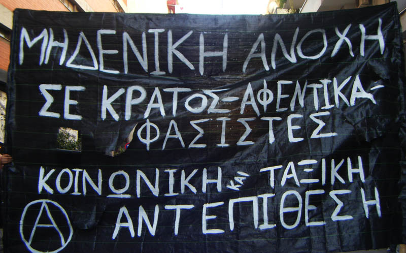 Στο αναρχικό μπλοκ που σχηματίστηκε ύστερα από κάλεσμα της συνέλευσης αναρκών ενάντια στη μισθωτή σκλαβιά, “ο εργαλειοφόρος”, συμμετείχαν περίπου 400 άτομα. Το κεντρικό πανό έγραφε “μηδενική ανοχή σε κράτος-αφεντικά-φασίστες — κοινωνική και ταξική αντεπίθεση.