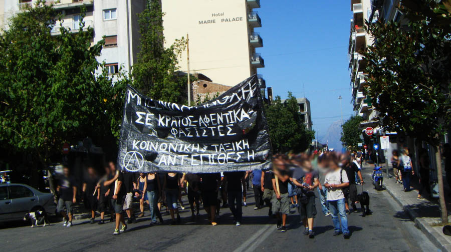 Το αναρχικό-αντιεξουσιαστικό μπλοκ, αριθμούσε περίπου 400 άτομα και ξεκίνησε με προσυγκέντρωση από το Παράρτημα μαζί με τα μπλοκ των φοιτητικών συλλόγων, μαθητών και του ΕΕΚ. Στο κεντρικό πανό του μπλοκ υπήρχε το σύνθημα “ενάντια σε κράτος-αφεντικα-φασίστες, κοινωνική και ταξική αντεπίθεση”. Η πορεία ακολούθησε το κλασικό δρομολόγιο από Εργατικό κέντρο-Κολοκοτρώνη-Οθ. Αμαλίας-Γούναρη-Κορίνθου και διαλύθηκε στο Παράρτημα. Ήταν μια πρώτη δυναμική απάντηση στην κρατική και παρακρατική τρομοκρατία που τον τελευταίο καιρό έχει ενταθεί και επιχειρεί να επιβάλλει ένα νέο καθεστώς ολοκληρωτισμού σε κάθε πεδίο της καθημερινότητας.