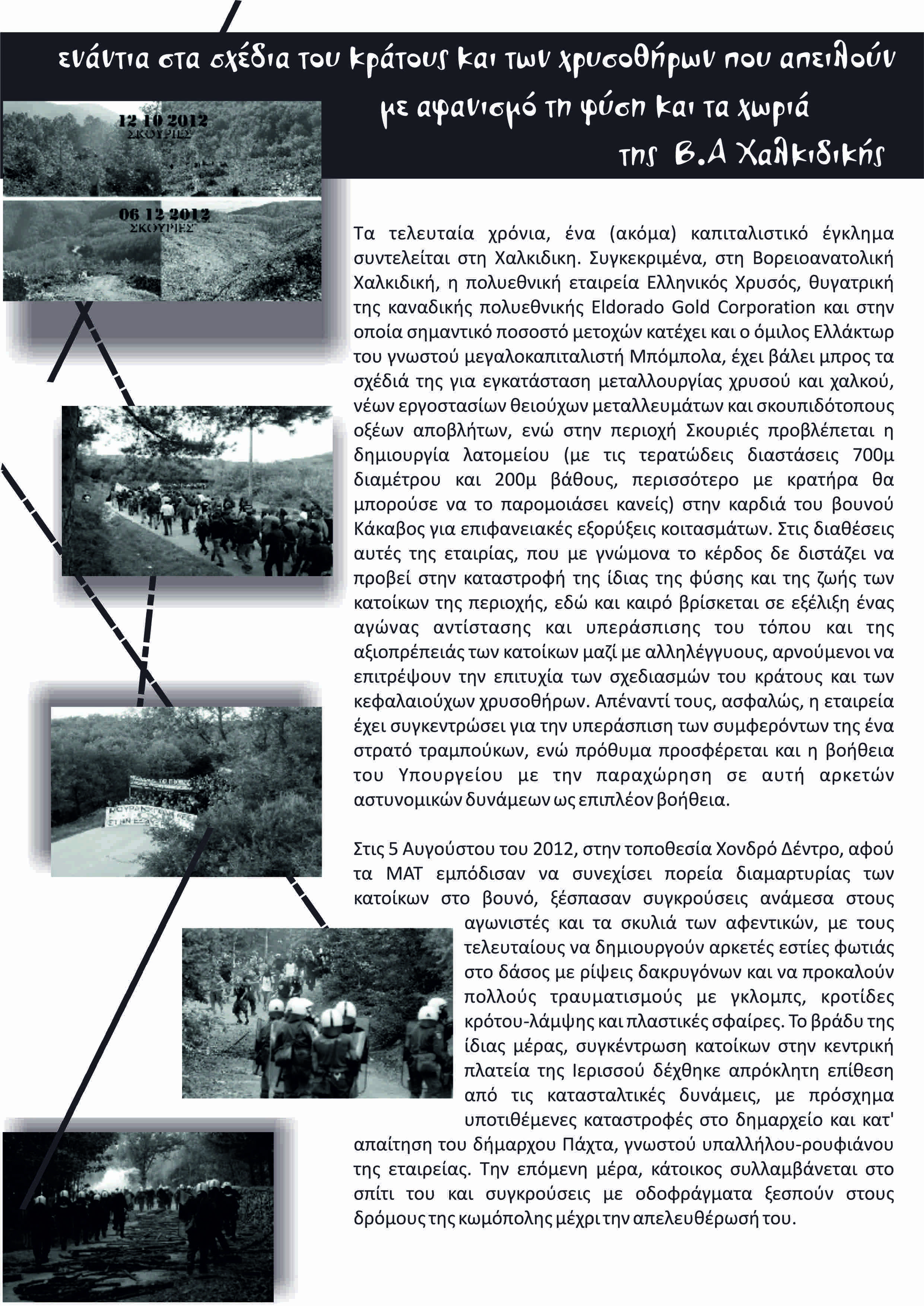 Τα τελευταία χρόνια, ένα (ακόμα) καπιταλιστικό έγκλημα συντελείται στη Χαλκιδικη. Συγκεκριμένα, στη Βορειοανατολική Χαλκιδική, η πολυεθνική εταιρεία Ελληνικός Χρυσός, θυγατρική της καναδικής πολυεθνικής Eldorado Gold Corporation και στην οποία σημαντικό ποσοστό μετοχών κατέχει και ο όμιλος Αλλάκτωρ του γνωστού μεγαλοκαπιταλιστή Μπόμπολα, έχει βάλει μπρος τα σχέδιά της για εγκατάσταση μεταλλουργίας χρυσού και χαλκού, νέων εργοστασίων θειούχων μεταλλευμάτων και σκουπιδότοπους οξέων αποβλήτων, ενώ στην περιοχή Σκουριές προβλέπεται η δημιουργία λατομείου (με τις τερατώδεις διαστάσεις 700μ διαμέτρυ και 200μ βάθους, περισσότερο με κρατήρα θα μπορούσε να το παρομοιάσει κανείς) στην καρδιά του βουνού Κάκαβος για επιφανειακές εξορύξεις κοιτασμάτων. Στις διαθέσεις αυτές της εταιρίας, που με γνώμονα το κέρδος δε διστάζει να προβεί στην καταστροφή της ίδιας της φύσης και της ζωής των κατοίκων της περιοχής, εδώ και καιρό βρίσκονται σε εξέλιξη ένος αγώνα αντίστασης και υπεράσπισης του τόπου και της αξιοπρέπειάς τους οι κάτοικοι μαζί με αλληλέγγυους, αρνούμενοι να επιτρέψουν την επιτυχία των σχεδιασμών του κράτους και των κεφαλαιούχων χρυσοθήρων. Απέναντί τους, ασφαλώς, η εταιρεία έχει συγκεντρώσει για την υπεράσπιση των συμφερόντων της ένα στρατό τραμπούκων, ενώ πρόθυμα προσφέρεται και η βοήθεια του Υπουργείου με την παραχώρηση σε αυτή αρκετών αστυνομικών δυνάμεων ως επιπλέον βοήθεια.