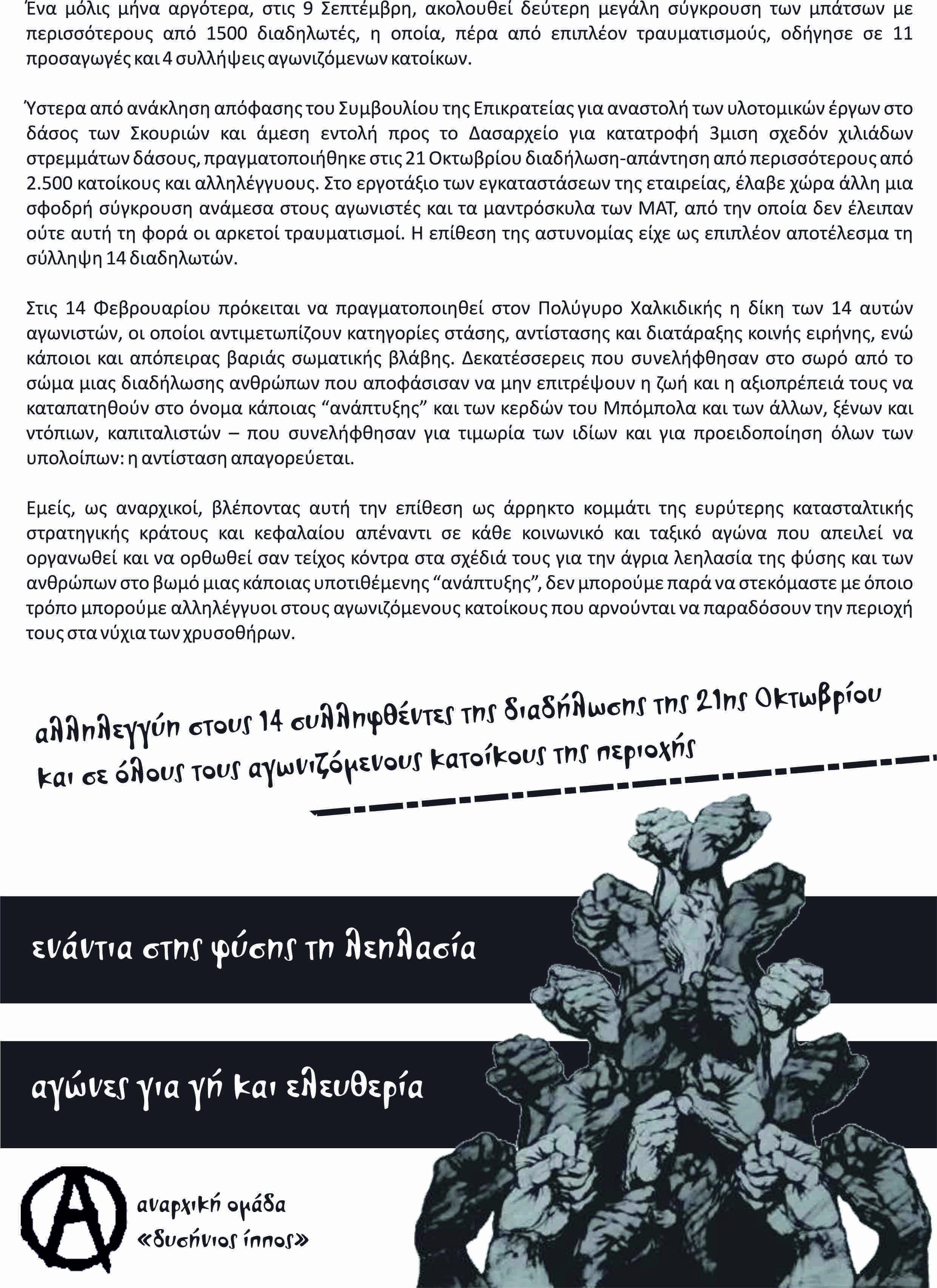στο πλευρό του ανυποχώρητου αγώνα των κατοίκων της Β.Α. Χαλκιδικής ενάντια στην καταστολή και τα σχέδια του κράτους και της Ελληνικός Χρυσός (θυγατρική της πολυεθνικής Eldorado Gold) για την εγκατάσταση μεταλλείων εξόρυξης χρυσού στα δάση του όρους Κάκκαβος και τον αφανισμό της φύσης και των χωριών της περιοχής, στο βωμό της ανάπτυξης.