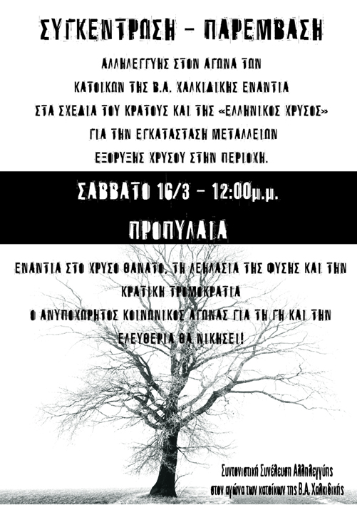 (επίσης, την Παρασκευή 22 Μάρτη στις 8μμ η Συντονιστική Συνέλευση Αλληλεγγύης καλεί σε συζήτηση στο Πολυτεχνέιο της Αθήνας για τη διοργάνωση κεντρικής πορείας αλληλεγγύης στον αγώνα των κατοίκων της ΒΑ Χαλκιδικής)