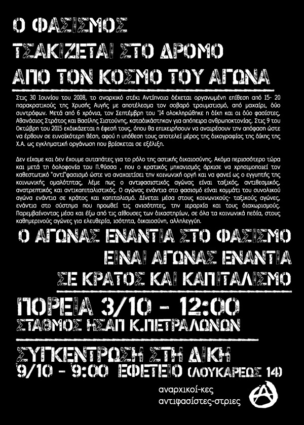 Η οργανωμένη παρουσία του αναρχικού και αντιφασιστικού κινήματος στη δίκη της Χρυσής Αυγής, τις ημέρες εκδίκασης της υπόθεσης για τη δολοφονική επίθεση στο στέκι Αντίπνοια από τάγμα εφόδου της Χ.Α. τον Ιούνιο του 2008, αποτελεί ακόμα ένα σημείο του αγώνα ενάντια στα παρακρατικά τάγματα εφόδου και τους κρατικούς πάτρωνές τους.