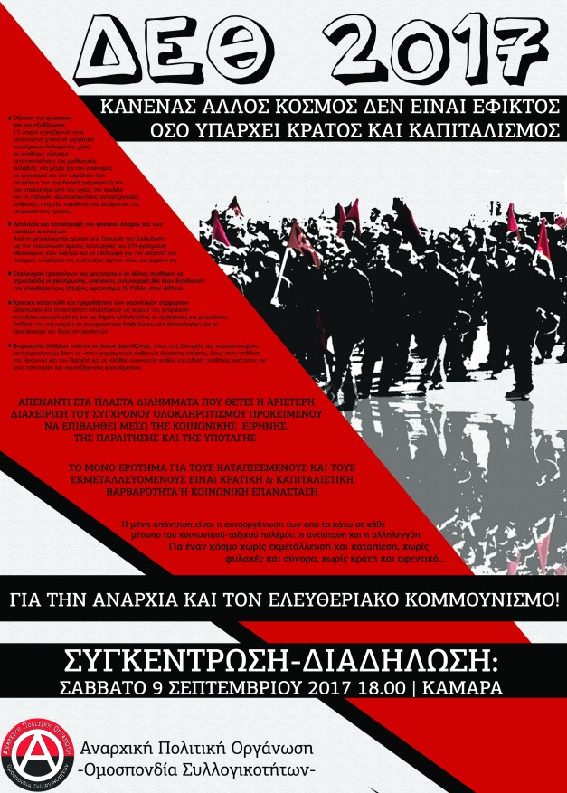 Για ακόμη μια φορά καλούμαστε να γίνουμε θεατές στο ετήσιο πανηγύρι κράτους και αφεντικών, στη Διεθνή Έκθεση Θεσσαλονίκης. Μια ετήσια προσπάθεια του πολιτικού προσωπικού και των οικονομικών ελίτ να παρουσιάσουν με όρους εξωραϊσμού τις συνθήκες που βαραίνουν την κοινωνική πλειοψηφία. Η νέα πολιτική διαχείριση, χρησιμοποιώντας το κεφάλαιο συναίνεσης που απέσπασε από τις πρόσφατες εκλογές, θα εξαγγείλει από το βήμα της έκθεσης το αντικοινωνικό πολιτικό της πρόγραμμα, ένα πρόγραμμα που ανταποκρίνεται πλήρως στις επιταγές του σύγχρονου ολοκληρωτισμού.