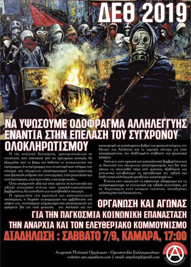 Ενάντια στην κρατική και καπιταλιστική βαρβαρότητα και τη δυστοπία του σύγχρονου ολοκληρωτισμού, που δεν έχει τίποτα να υποσχεθεί πέρα από φτώχεια, εξαθλίωση και κοινωνικό κανιβαλισμό να προτάξουμε την ταξική και διεθνιστική αλληλεγγύη μεταξύ των καταπιεσμένων. Ενάντια στην καταστολή να υψώσουμε οδόφραγμα αλληλεγγύης και να αναζωπυρώσουμε τις κοινωνικές και ταξικές αντιστάσεις, για τη δημιουργία ενός κόσμου ισότητας, ελευθερίας, αλληλεγγύης και δικαιοσύνης.