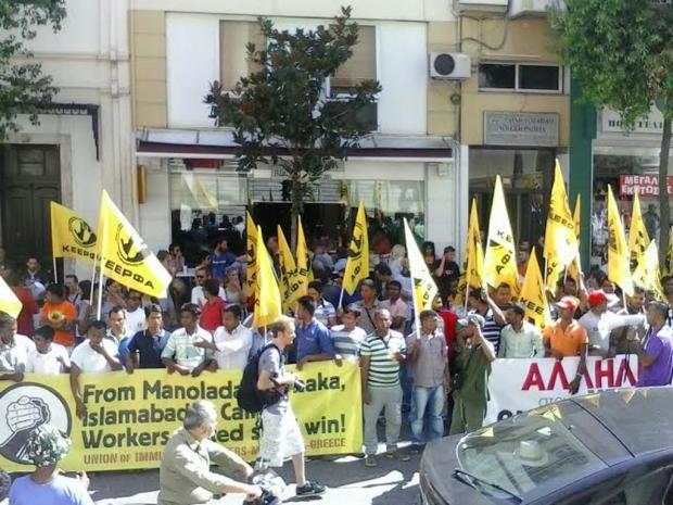 Παράλληλα, σήμερα ήταν και η προτελευταία μέρα της πολυήμερης δίκης του μεγαλοτσιφλικά Βαγγελάτου και των επιστατών μπράβων του που στις 17 Απρίλη 2013 πυροβόλησαν με καραμπίνες και τραυμάτισαν σοβαρά 35 μετανάστες – εργάτες γης που διεκδικούσαν τα δεδουλευμένα τους στη Νέα Μανωλάδα Ηλείας. Πριν την έναρξη της δίκης πραγματοποιήθηκε πορεία στο κέντρο της πόλης από μετανάστες εργάτες γης και αλληλέγγυους που κατέληξε σε συγκέντρωση έξω από τα δικαστήρια.