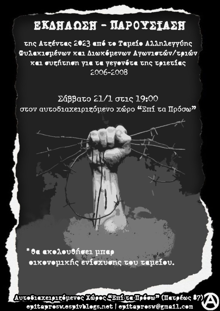 Εκδήλωση-Παρουσίαση της Ατζέντας 2023 από το Ταμείο Αλληλεγγύης Φυλακισμένων και Διωκόμενων Αγωνιστών/τριών και συζήτηση για τα γεγονότα της τριετίας 2006-2008